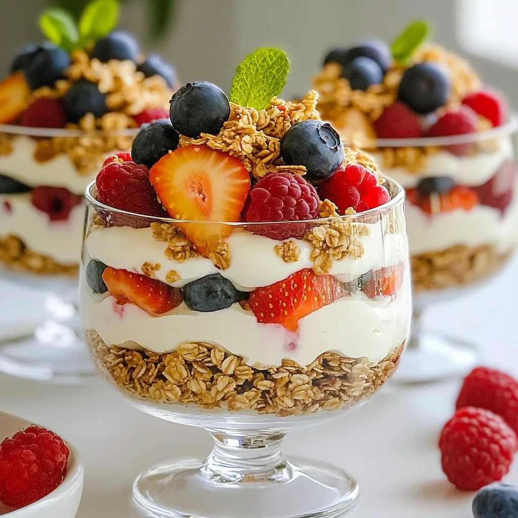 A delightful layered dessert featuring Greek yogurt, granola, and mixed berries.
