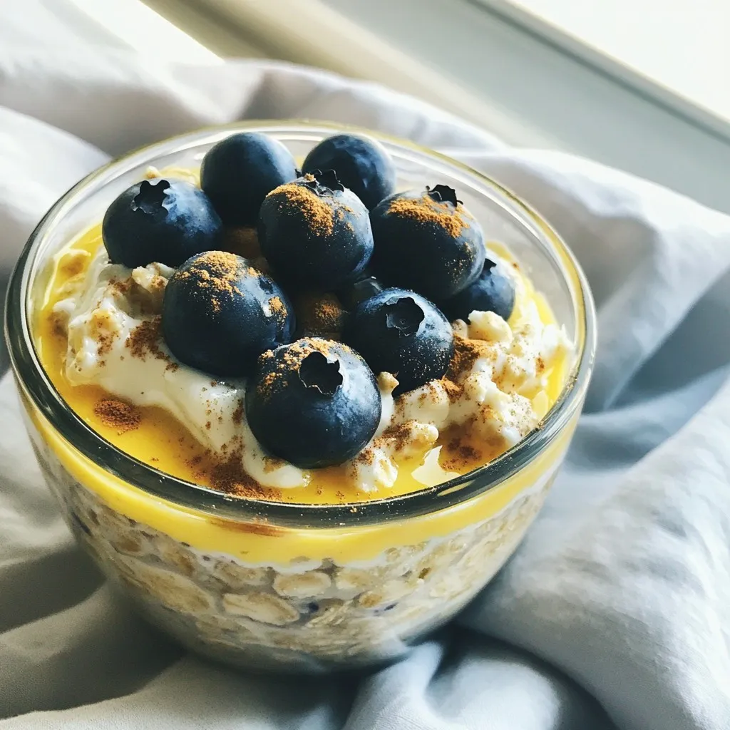 For the perfect Blueberry Cheesecake Overnight Oats, gather these simple ingredients: - 1 cup rolled oats - 1 cup almond milk (or your preferred milk) - 1/2 cup Greek yogurt - 1/4 cup cream cheese, softened to room temperature - 1/4 cup maple syrup (adjust based on sweetness preference) - 1 teaspoon pure vanilla extract - 1 cup fresh blueberries (plus extra for garnish) - 1 tablespoon fresh lemon juice - 1/2 teaspoon ground cinnamon - A pinch of sea salt You can easily swap ingredients to fit your taste. Here are some ideas: - Use coconut milk or soy milk instead of almond milk. - Substitute low-fat yogurt for Greek yogurt for fewer calories. - Try ricotta cheese instead of cream cheese for a lighter texture. - Maple syrup can be replaced with honey or agave syrup. - Use frozen blueberries if fresh ones are not available. Each serving of Blueberry Cheesecake Overnight Oats offers a balance of nutrients: - Calories: Approximately 350 - Protein: 12g - Carbohydrates: 50g - Fat: 10g - Fiber: 6g - Sugar: 15g This dish provides energy to start your day right. Enjoy the delicious mix of flavors and nutrients! {{ingredient_image_2}} To make blueberry cheesecake overnight oats, start with simple steps. Gather your ingredients first. You will need rolled oats, almond milk, Greek yogurt, cream cheese, maple syrup, vanilla extract, fresh blueberries, lemon juice, ground cinnamon, and a pinch of sea salt. The whole process takes about ten minutes to prep. After mixing, let the oats chill overnight. This helps the flavors blend well. When layering your oats, use a mason jar or a bowl. First, add half of the oat mixture. Spoon in the oats and almond milk blend. Make sure the oats are fully mixed with the milk. Next, add half of the cheesecake mixture. This is made from Greek yogurt, cream cheese, maple syrup, and spices. Then, sprinkle in half of the blueberries. For the second layer, repeat the same steps. Top with the final oats, cheesecake mix, and the rest of the blueberries. This creates a beautiful, tasty treat! Mixing ingredients well is key to perfect overnight oats. When you blend the Greek yogurt and cream cheese, make sure there are no lumps. A smooth mix gives a nice creamy texture. Use a whisk or a hand mixer for ease. Taste the cheesecake mix before layering. You can adjust sweetness by adding more maple syrup if you like it sweeter. Always remember to stir the oats gently before serving. This ensures all layers combine for a delightful bite. To make your overnight oats great, start with rolled oats. They soak up liquid well. Use one cup of oats and mix them with one cup of almond milk. Stir until all oats are wet. This gives them a soft texture. Let them sit overnight in the fridge. The oats will absorb the milk and become creamy. To make your oats taste like cheesecake, mix Greek yogurt and cream cheese. Use half a cup of Greek yogurt and a quarter cup of cream cheese. Add a quarter cup of maple syrup for sweetness. You can adjust the syrup based on your taste. A teaspoon of vanilla extract adds a nice touch too. For extra flavor, squeeze in a tablespoon of fresh lemon juice. This brightens the dish. A half teaspoon of ground cinnamon gives warmth. A pinch of sea salt balances the flavors. Layer your oats, cheesecake mix, and fresh blueberries. This makes each bite exciting! - Storage Tips for Freshness: - Keep your oats in a sealed jar or bowl. This helps keep them fresh. - Store them in the fridge for up to four days. - Stir them before eating for the best taste. These tips will help you create delicious blueberry cheesecake overnight oats every time! Pro Tips Use Fresh Blueberries: Always opt for fresh blueberries for the best flavor and texture. Frozen blueberries can be used in a pinch, but they may release more moisture into the oats. Adjust Sweetness to Taste: The amount of maple syrup can be adjusted based on your personal preference for sweetness. Start with less and add more if needed after mixing the ingredients. Layer Creatively: Experiment with the layering process by adding different fruits or nuts between the layers for added crunch and flavor. Chopped almonds or walnuts can make a great addition! Make Ahead for Busy Mornings: These overnight oats are perfect for meal prep. Make a few jars at once and store them in the fridge for a quick and nutritious breakfast throughout the week. {{image_4}} You can mix up the flavor of your blueberry cheesecake overnight oats. Instead of blueberries, try strawberries or raspberries. Use peach slices for a summer twist. Change the yogurt to a flavored kind like vanilla or lemon for more zest. You can also swap the maple syrup for honey or agave syrup to find your perfect sweetness. If you want a vegan version, replace Greek yogurt and cream cheese with cashew cream or a plant-based yogurt. Almond milk works great, but you can use coconut or oat milk too. Sweeten with agave syrup or maple syrup. This way, you keep the creamy texture without using dairy. Toppings can make your oats even better. Add nuts like almonds or walnuts for crunch. Seeds like chia or flaxseed boost fiber and omega-3s. You can sprinkle some granola for a crunchy layer. Fresh fruit on top looks great and adds more flavor. Try adding a dollop of nut butter for healthy fats and protein. To keep your blueberry cheesecake overnight oats fresh, use an airtight container. I prefer mason jars for their tight seals and easy transport. After preparing them, seal the jars and place them in the refrigerator. This keeps the oats creamy and prevents them from drying out. When making overnight oats, always prepare a few jars at once. This saves time for busy mornings. You can make them up to four days ahead. Just ensure you store them properly. Layer the ingredients as instructed to maximize flavor and texture. Remember to give them a good stir before serving to mix the layers. The oats can last up to five days in the fridge. Fresh blueberries are best eaten within two days. Gree