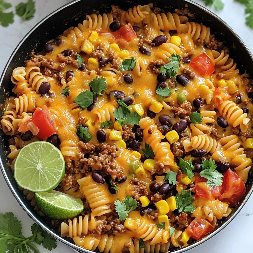 A delicious and easy one-pan meal combining pasta, ground meat, and cheesy goodness with a taco twist.