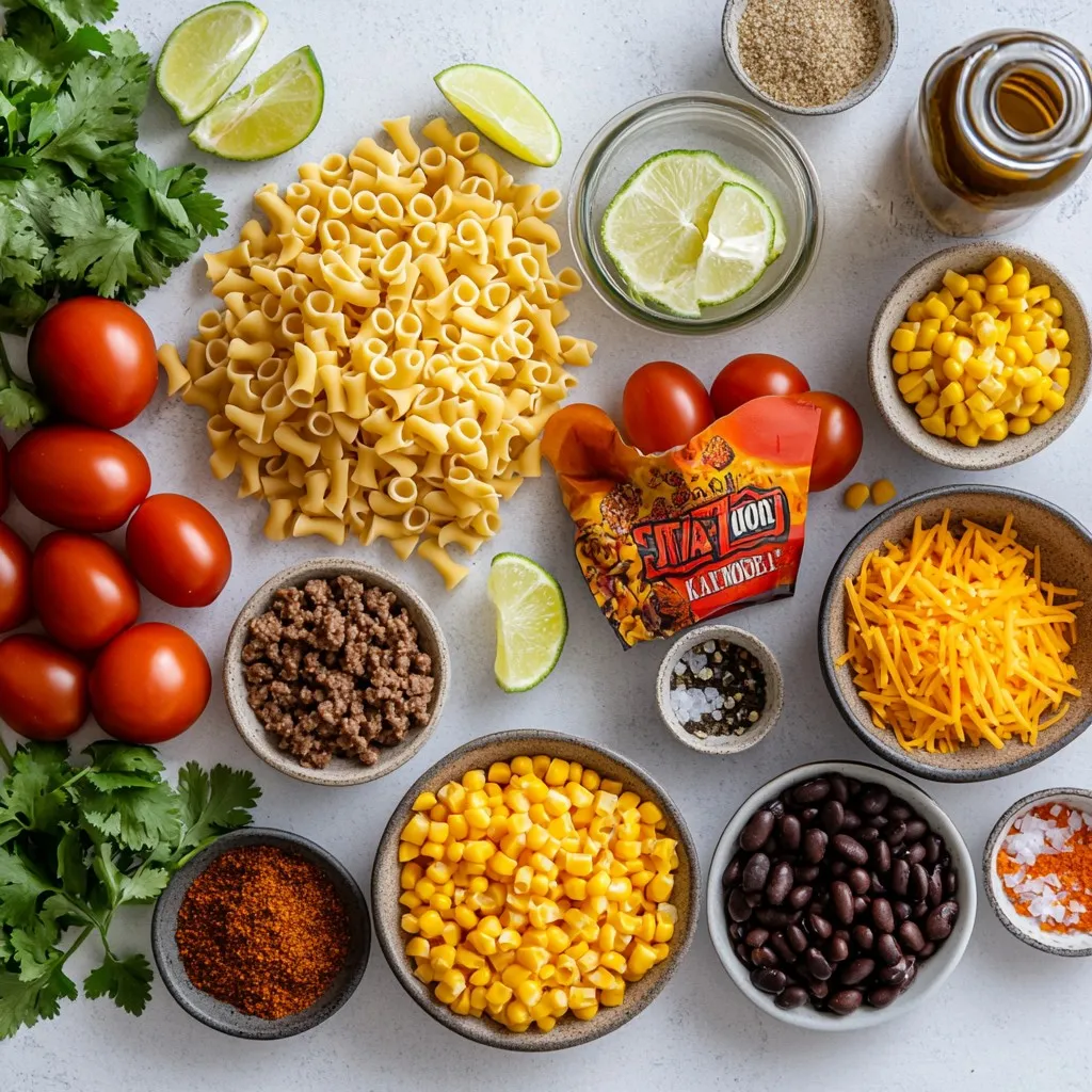 You need these items to make a tasty cheesy taco pasta skillet. The pasta gives a fun texture. Ground beef or turkey adds protein. Taco seasoning brings bold flavors. Diced tomatoes add freshness. Sweet corn adds a nice crunch. Black beans boost fiber and heartiness. Cheddar cheese gives creaminess. Broth helps cook the pasta just right. Olive oil adds richness. Garlic and onion powders enhance the taste. Salt and pepper bring it all together.