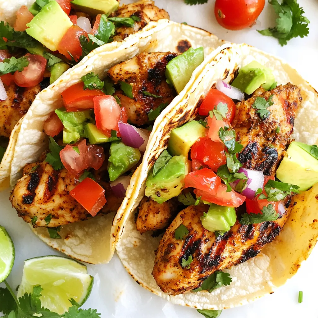 Now, slice the grilled chicken into thin strips. Take a warm tortilla and lay a few strips of chicken in the center. Top it with diced tomatoes, chopped red onion, and avocado slices. Garnish with fresh cilantro leaves. Serve with lime wedges on the side for squeezing over the tacos. Enjoy your vibrant meal!