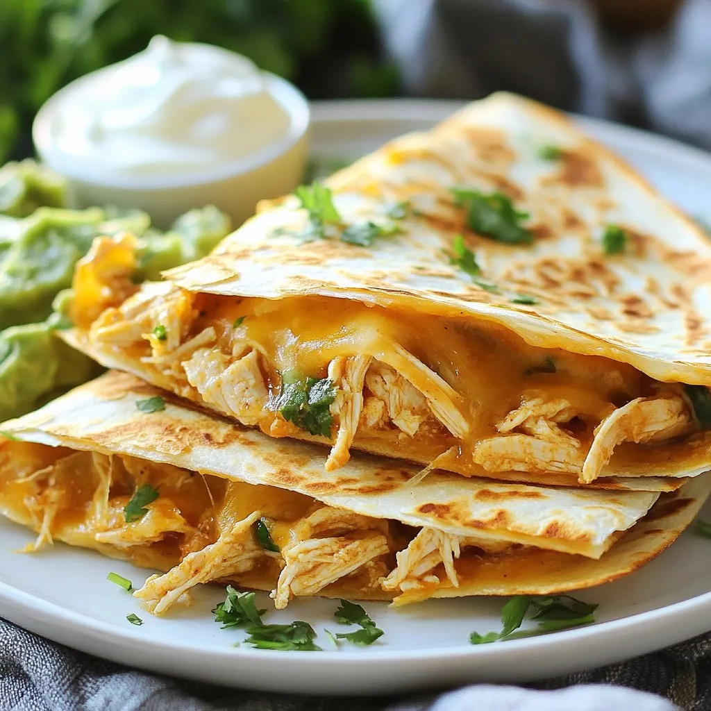For serving, I cut each quesadilla into wedges. I arrange them nicely on a platter. I like to garnish with fresh cilantro for color. It looks great! I also serve small bowls of sour cream and guacamole on the side. These toppings offer a cool contrast to the spicy chicken. You can also pair these quesadillas with a simple salad or some rice for a full meal. Enjoy each bite of this flavorful delight!