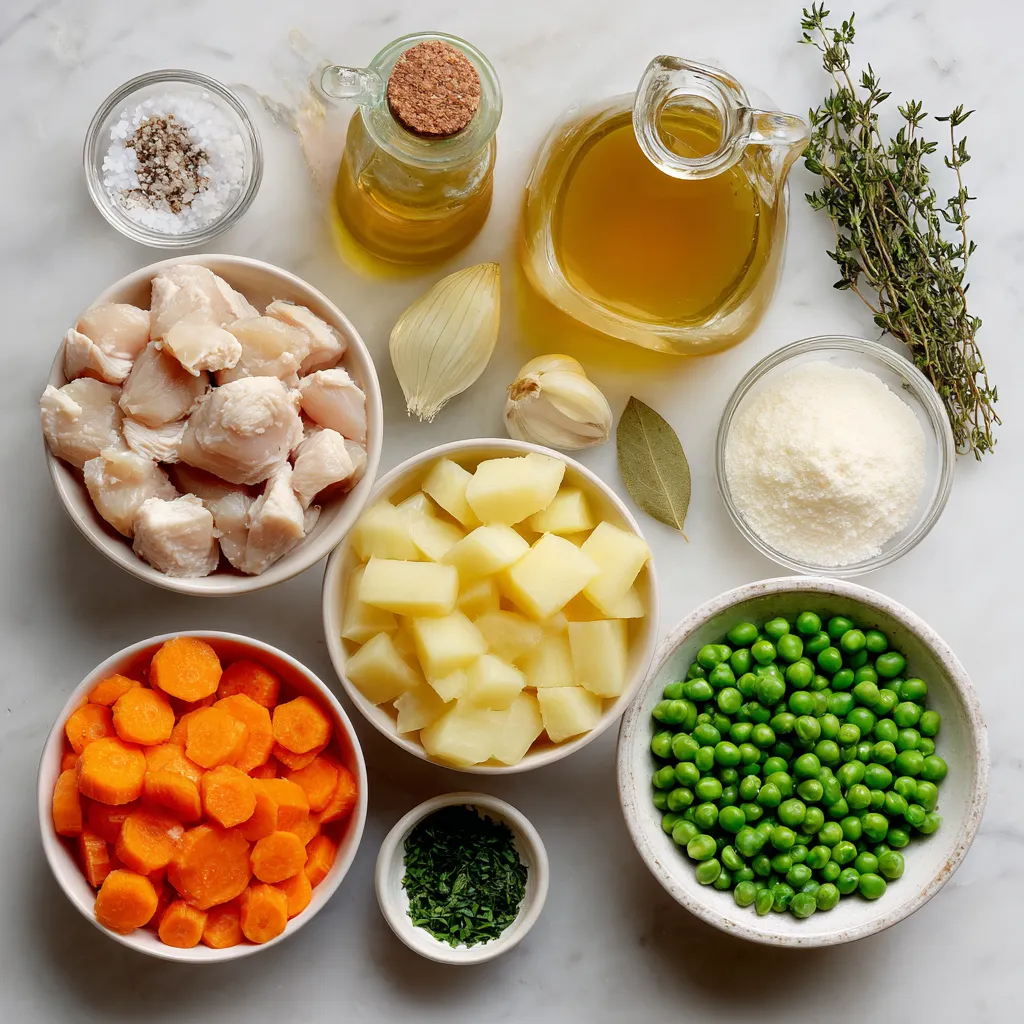 The main ingredients create the heart of the dish. I love using boneless skinless chicken thighs. They stay moist and add great flavor. The carrots and potatoes bring sweetness and texture. Onions and garlic give depth.