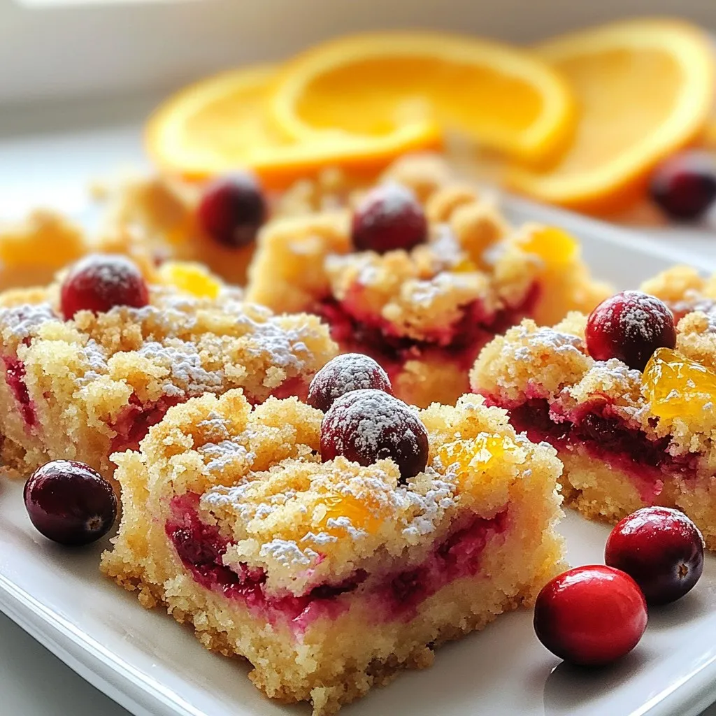 Delicious crumb bars filled with tart cranberries and zesty orange, perfect for dessert or a snack.