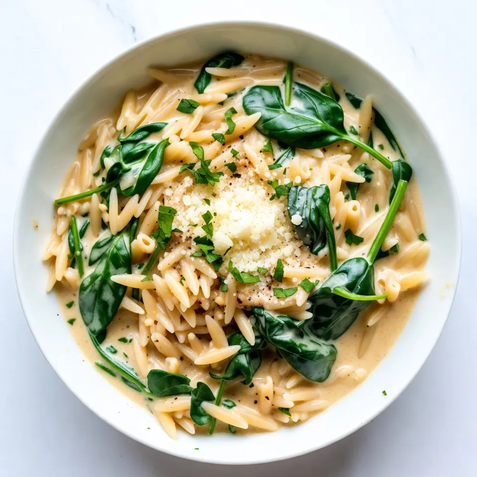 A creamy and flavorful orzo dish with garlic and fresh spinach.