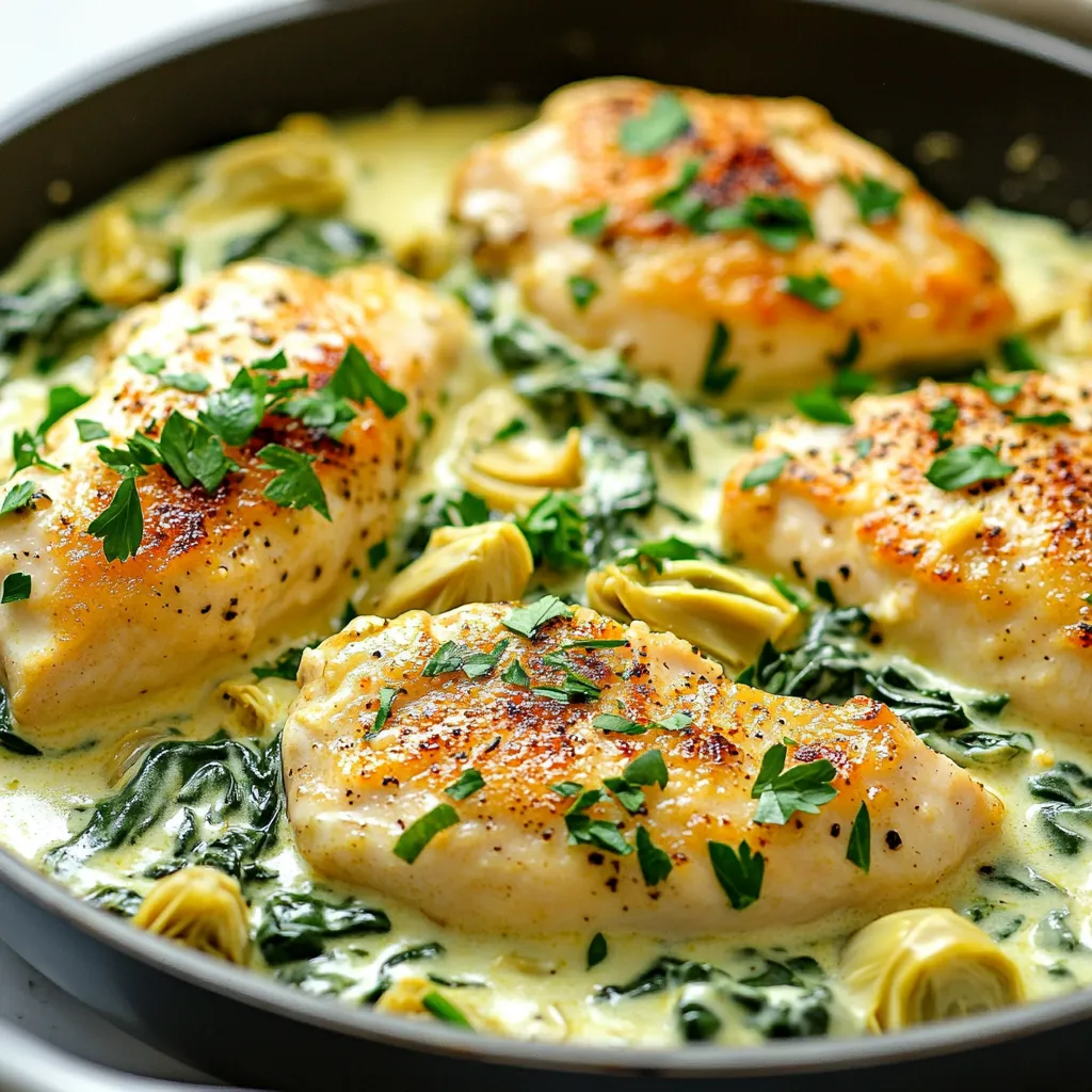 A delicious and creamy chicken dish featuring spinach and artichokes, perfect for a quick weeknight meal.