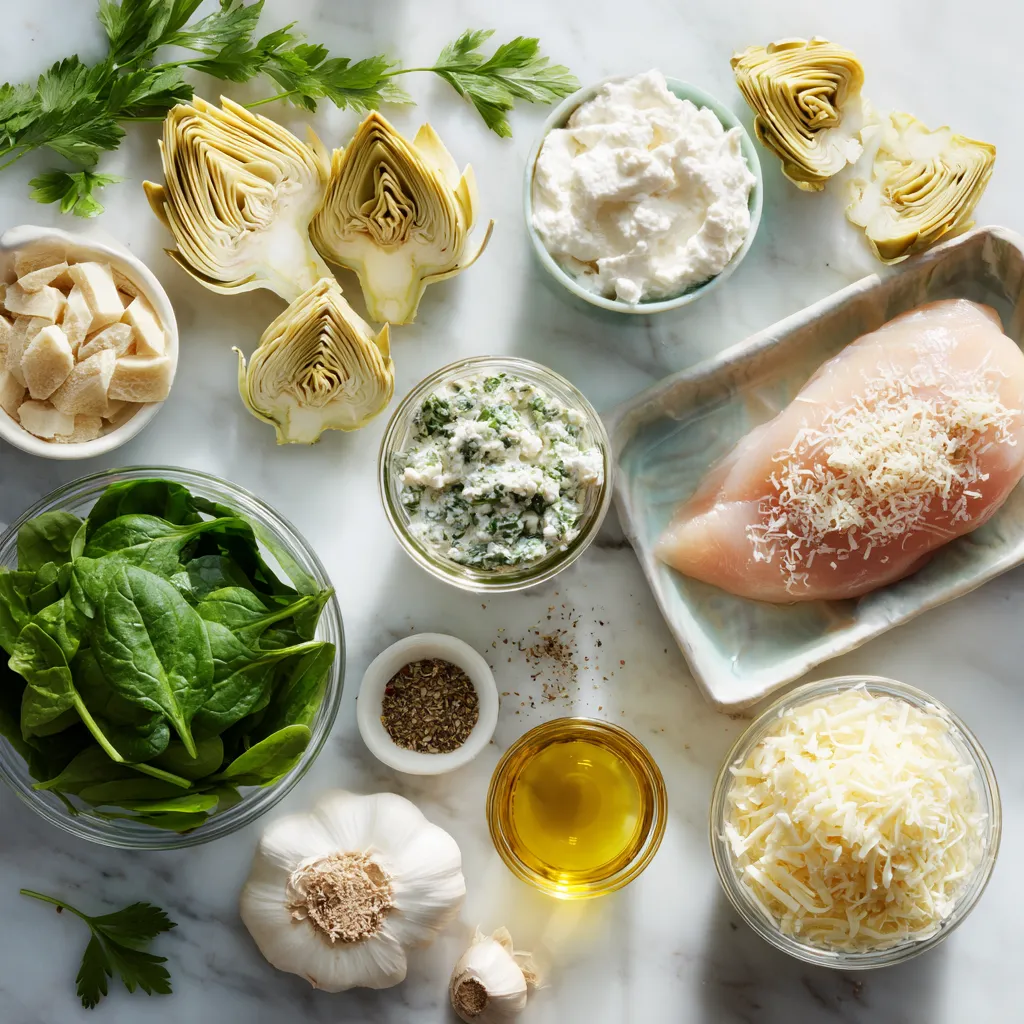 You need chicken breasts for the main protein. They are tasty and filling. Spinach and artichokes add nutrition and flavor. Cream cheese and Greek yogurt make the dish creamy and rich. The cheese blend of mozzarella and Parmesan gives it a perfect finish.