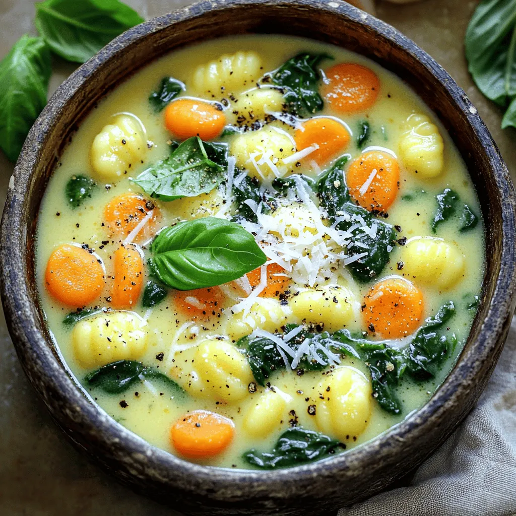 To get started, gather these main ingredients: - 1 tablespoon olive oil - 1 medium onion, finely diced - 3 cloves garlic, minced - 2 medium carrots, peeled and diced - 2 celery stalks, diced These ingredients create a tasty base for your soup. The olive oil adds richness, while the onion and garlic give a great aroma. Carrots and celery add sweetness and crunch. Next, you’ll need some seasonings to enhance the flavor: - 1 teaspoon dried thyme - 1 teaspoon dried basil - 5 cups vegetable broth (preferably low-sodium) - 1 (14-ounce) can diced tomatoes, including juices These seasonings bring warmth and depth. The broth is the heart of the soup, while tomatoes add a juicy burst. Finally, finish off your soup with these final touches: - 1 (16-ounce) package shelf-stable gnocchi - 2 cups fresh baby spinach - 1 cup heavy cream - Salt and freshly ground black pepper, to taste - Grated Parmesan cheese, for serving (optional) - Fresh basil leaves, torn, for garnish Gnocchi makes the soup hearty. Spinach adds color and nutrition. Heavy cream creates a rich texture. Season with salt and pepper for balance. Parmesan and fresh basil are perfect for a beautiful presentation. For the complete recipe, check out the [Full Recipe]. To start, grab a large pot. Heat one tablespoon of olive oil over medium heat. Next, add one medium onion, finely diced. Sauté the onion for about 3-4 minutes. Stir it often until the onion softens and turns translucent. Then, add three cloves of minced garlic. Toss in two medium carrots, peeled and diced, along with two diced celery stalks. Cook these vegetables for 5 minutes. Stir frequently until they are tender but not brown. Now, it’s time for the herbs! Sprinkle in one teaspoon of dried thyme and one teaspoon of dried basil. Stir well for about 30 seconds. This will help release the beautiful flavors of the herbs. Carefully pour in five cups of vegetable broth. Add one can of diced tomatoes, including the juices. Bring this mixture to a gentle boil, stirring occasionally. Once boiling, reduce the heat to a low simmer. Add your package of shelf-stable gnocchi. Cook according to the package directions, usually about 2-3 minutes, or until the gnocchi float to the top. Gently fold in two cups of fresh baby spinach and one cup of heavy cream. Allow the soup to cook for another 2-3 minutes. This will let the spinach wilt and the soup heat evenly. Taste the soup now. Season it with salt and freshly ground black pepper to your liking. To serve, ladle the soup into deep bowls. Top it off with freshly grated Parmesan cheese and torn basil leaves for a bright finish. For an extra touch, serve with some crusty bread to dip in the soup. You can find the full recipe [here]. To create the perfect creamy texture, use heavy cream. You can adjust the creaminess by adding more or less. If you want the soup thicker, let it simmer longer. This allows the gnocchi to soak up some broth, making it heartier. For a lighter option, swap heavy cream for half-and-half or coconut milk. Season your soup to taste. I suggest adding more thyme or basil for depth. A pinch of red pepper flakes can add a nice kick. If you love garlic, add an extra clove or two. Taste your soup as you go. This helps you find the right balance of flavors. Use a large pot to cook the soup evenly. An immersion blender can help if you prefer a smoother texture. To save time, chop your veggies in advance. You can also buy pre-diced vegetables to cut down on prep. Keep a timer handy to avoid overcooking the gnocchi. This way, you’ll have a perfect bowl of soup every time. For the complete recipe, check out the Full Recipe section. {{image_4}} You can easily change the recipe to fit what you have. If you want to swap vegetables, try zucchini or bell peppers. You can also use chicken broth instead of vegetable broth for a richer base. For a lighter soup, consider using half-and-half instead of heavy cream. These small changes can still keep the soup tasty. To make the soup heartier, add proteins like cooked chicken or Italian sausage. This will give a nice boost to the flavor. You can also play with spices. For a kick, add red pepper flakes or a dash of smoked paprika. Each of these options changes the soup's taste while keeping it full of goodness. If you need a gluten-free option, choose gluten-free gnocchi. Many brands now offer this. For a vegan version, swap heavy cream for coconut milk or a nut cream. You can also use vegetable broth and skip any animal products. These adaptations let everyone enjoy this creamy delight. For the complete recipe, check the Full Recipe section. To keep your soup fresh, store it in an airtight container. Before sealing, let the soup cool to room temperature. This prevents steam from building up and keeps the flavors intact. Place the container in the fridge. Your soup will stay good for about 3 to 4 days. When you are ready to enjoy your soup again, use the stove for the best flavor. Pour the soup into a pot and heat it over medium-low. Stir it gently to avoid sticking. If the soup seems too thick, add a splash of broth or water. Heat until it is warm throughout. For longer storage, you can freeze this soup. Use freezer-safe containers, leaving space at the top for expansion. It’s best to freeze the soup without the cream. This way, the texture stays nice. When you want to eat it, thaw it in the fridge overnight. Reheat it on the stove and add the cream just before serving. This ensures your soup keeps all its rich flavors. For the full recipe, refer to the Full Recipe section above. Creamy Tuscan Gnocchi Soup lasts about three to four days in the fridge. To store it well, place it in an airtight container. Make sure the soup cools down before you seal it. This keeps it fresh and tasty. Always check for any signs of spoilage, like odd smells or colors, before eating. You can make this soup ahead of time! It tastes even better the next day. To do this, prepare the soup but keep the gnocchi s
