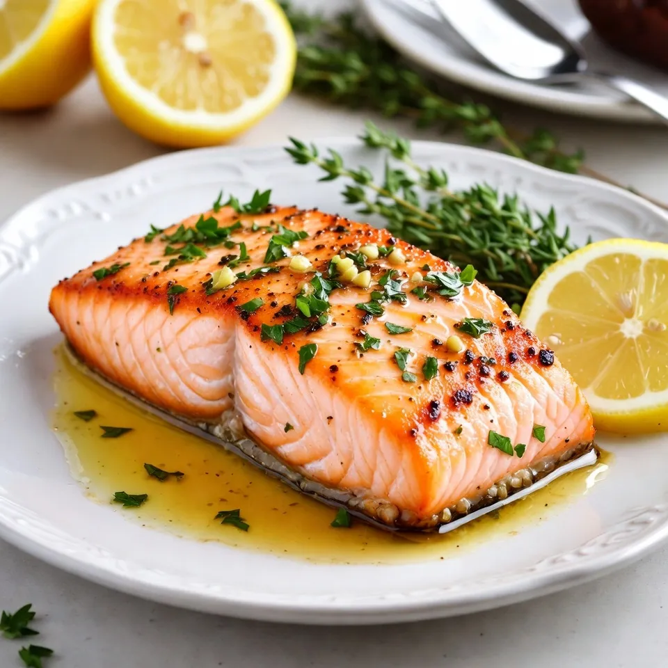 Once cooked, remove the salmon from the oven and allow it to rest for a couple of minutes. Serve the fillets with fresh lemon wedges on the side, and if desired, add a garnish of fresh thyme sprigs for a touch of elegance.