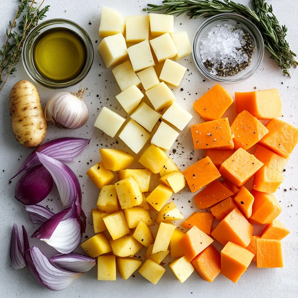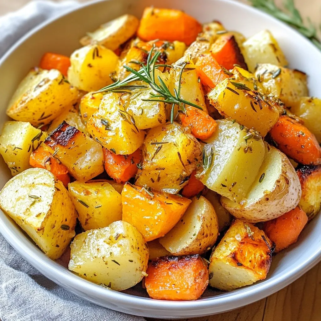 For this recipe, I use a mix of colorful root veggies. These veggies add great taste and texture. Here’s what you need: - 4 medium carrots, peeled and cut into bite-sized chunks - 3 medium parsnips, peeled and cut into similarly sized chunks - 2 medium Yukon gold or red potatoes, diced evenly - 1 medium sweet potato, peeled and diced - 1 red onion, cut into wedges or large pieces These root vegetables bring a sweet and earthy flavor. Each one plays a role in the dish's overall taste. Garlic and fresh herbs are crucial for flavor. I use: - 4 cloves garlic, finely minced - 1 tablespoon fresh rosemary, roughly chopped - 1 tablespoon fresh thyme, roughly chopped The garlic adds a rich taste, while the herbs give it a fresh, aromatic touch. Together, they create a delightful blend. Seasonings enhance the dish's flavor. You will need: - 3 tablespoons extra virgin olive oil - Salt and freshly ground black pepper to taste The olive oil helps the veggies roast well. Salt and pepper bring out all the natural flavors. Mixing these ingredients creates the perfect base for our roasted root veggies. {{ingredient_image_2}} Start by preheating your oven to 425°F (220°C). This step is key. A hot oven helps the veggies roast well, giving them a nice texture and flavor. Next, gather your root vegetables. You will need: - 4 medium carrots, peeled and cut into bite-sized chunks - 3 medium parsnips, peeled and cut into similarly sized chunks - 2 medium Yukon gold or red potatoes, diced evenly - 1 medium sweet potato, peeled and diced - 1 red onion, cut into wedges or large pieces In a large mixing bowl, add all the prepared veggies. Stir gently to mix them well and set aside. In a small bowl, blend together: - 4 cloves garlic, finely minced - 3 tablespoons extra virgin olive oil - 1 tablespoon fresh rosemary, roughly chopped - 1 tablespoon fresh thyme, roughly chopped Mix these ingredients well. This mix will give your veggies a tasty boost. Drizzle the garlic herb mixture over the root vegetables. Use your hands or a big spoon to toss everything together. Make sure each piece is coated. This step is crucial for flavor. Once tossed, season the veggies with salt and freshly ground black pepper to taste. Give them another light toss to evenly spread the seasoning. Now, spread the seasoned veggies onto a large baking sheet lined with parchment paper. Arrange them in a single layer. This helps them roast evenly. Place the baking sheet in your preheated oven. Roast the veggies for 30-35 minutes. Halfway through, take them out and toss them gently. This ensures they cook and caramelize evenly. You want them tender and golden. After roasting, remove the baking sheet. Let the veggies cool for a few minutes before serving. This helps the flavors settle and makes them even more delicious. To get the best roast, always preheat your oven to 425°F (220°C). This step ensures the veggies cook evenly. Cut your root vegetables into even-sized pieces. This helps them roast at the same rate. Spread the veggies out on the baking sheet. Avoid crowding them, as this can lead to steaming instead of roasting. Toss them halfway through cooking for even browning. Aim for a golden color and a tender inside. Use fresh herbs like rosemary and thyme. They add depth to your dish. Mince the garlic finely for a stronger flavor. Mixing it with olive oil before adding to the veggies helps release its oils. Feel free to experiment with other herbs, like oregano or parsley. A splash of lemon juice before serving brightens the taste. Adding a pinch of smoked paprika can give a nice twist too. Serve the roasted veggies in a large bowl. This makes for an attractive display. Garnish with fresh herbs for a pop of color. Pair these veggies with grilled meats or a hearty grain dish. They also work well as a side for a festive meal. For a fun twist, try them in a salad or wrap. Roasted veggies can elevate any meal! Pro Tips Choose Fresh Veggies: Always opt for the freshest root vegetables available. They will have better flavor and texture, resulting in a more delicious dish. Even Sizing: Cut all vegetables to similar sizes to ensure they cook evenly. This prevents some pieces from being overcooked while others remain undercooked. Herb Variations: Feel free to experiment with different herbs like thyme, sage, or oregano for unique flavor profiles that can complement the sweetness of root veggies. Check for Doneness: Use a fork to test the tenderness of the vegetables around the 25-minute mark. If they are fork-tender and golden, they’re ready to be taken out. {{image_4}} You can mix in many other veggies. Try adding beets for sweetness. Turnips add a nice bite. You can also use rutabaga for a unique taste. Just chop them to match the size of your other veggies. This helps them roast evenly. If you don’t have rosemary or thyme, use what you have. Oregano gives a great taste too. Basil can add a fresh twist. You can even try using sage for a warm flavor. Feel free to experiment with dried herbs if fresh ones are not available. This recipe is super flexible for different diets. For a vegan option, the recipe is already plant-based. If you want it gluten-free, it’s naturally gluten-free as well. Looking for low-carb? Skip the potatoes and add more carrots or parsnips instead. Enjoy making this dish your own! To keep your garlic herb roasted root veggies fresh, let them cool. Place them in an airtight container. Store in the fridge for up to four days. Make sure they are completely cool before sealing to avoid moisture build-up. This helps maintain their flavor and texture. When you're ready to enjoy your leftovers, preheat your oven to 350°F (175°C). Spread the veggies on a baking sheet. Heat for about 10-15 minutes until warm. This method keeps the veggies crispy. You can also microwave them for a quicker option, but they may not stay as crispy. If you want to freeze your roasted veggies, let them cool fully first. Place them in freezer-safe 
