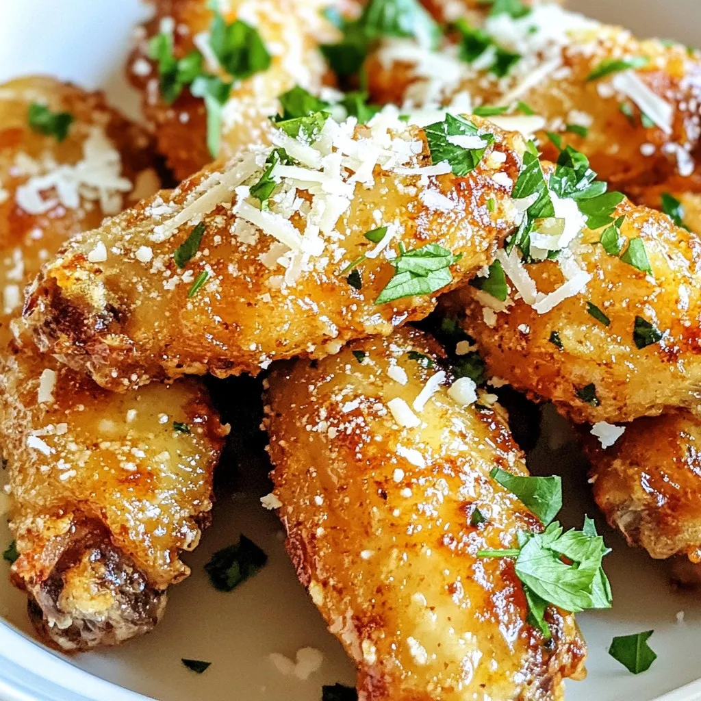 Crispy and flavorful chicken wings coated in garlic and Parmesan cheese, cooked to perfection in an air fryer.