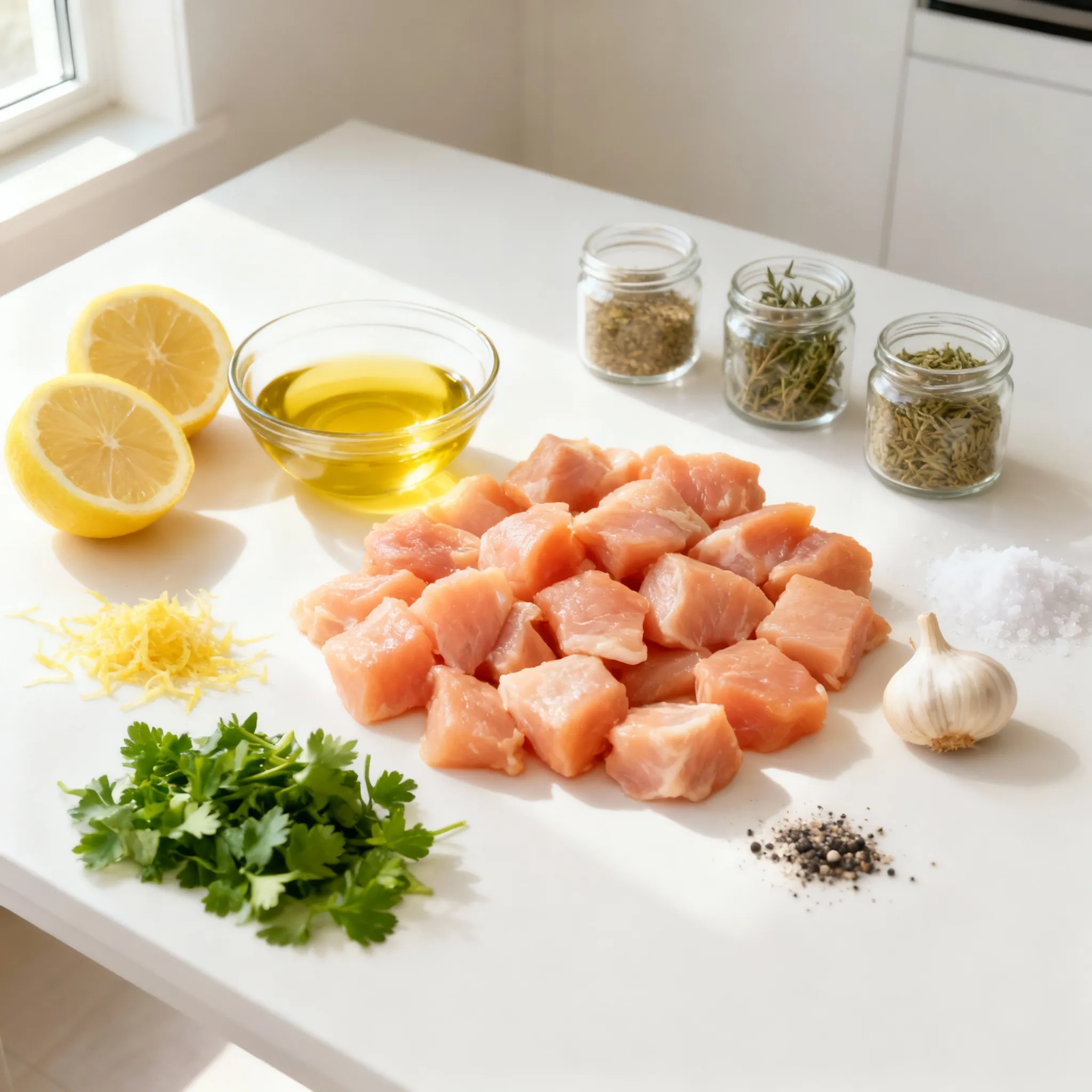 In a spacious bowl, whisk together the olive oil, fresh lemon juice, lemon zest, minced garlic, dried oregano, dried thyme, salt, and pepper until combined. Add the cubed chicken breast to the marinade, ensuring each piece is thoroughly coated. Cover the bowl with plastic wrap or a lid and refrigerate the chicken for a minimum of 1 hour, allowing it to soak in the flavors. For an enhanced taste, marinate the chicken for up to 4 hours.