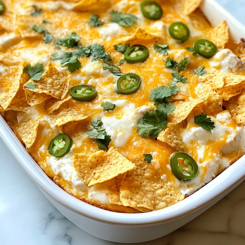 A creamy and cheesy chicken bake with a zesty kick from jalapeños, topped with crunchy tortilla chips.