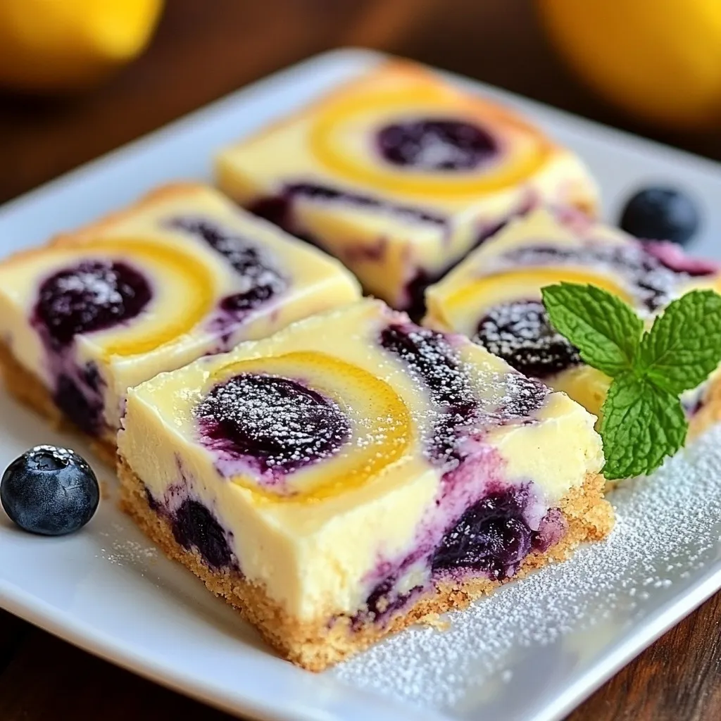 Delicious cheesecake bars with a lemon and blueberry flavor, perfect for a refreshing dessert.
