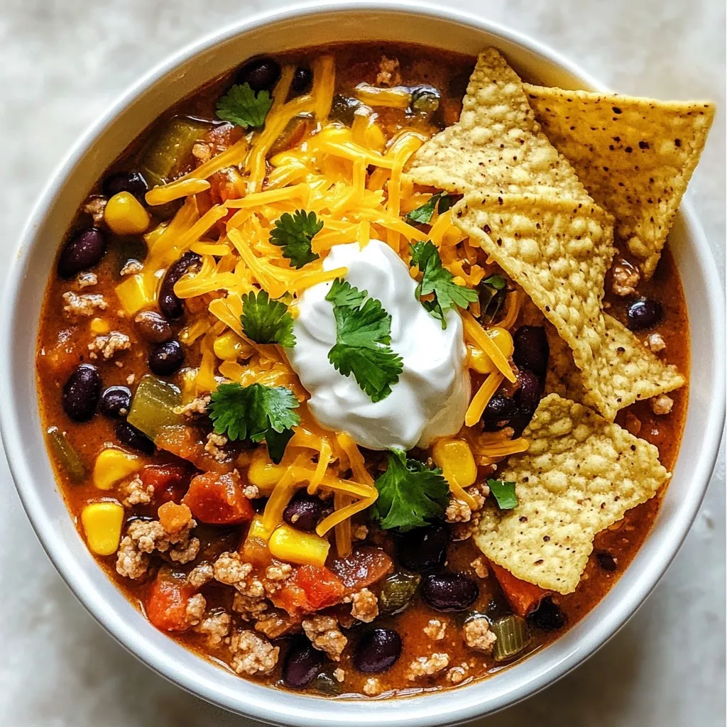 To make Loaded Taco Soup in a slow cooker, start by browning the ground turkey or beef in a skillet. This step adds flavor. After browning, transfer the meat to the slow cooker. Add diced onion, minced garlic, black beans, kidney beans, sweet corn, diced tomatoes, chicken broth, taco seasoning, cumin, and smoked paprika. Stir everything well. Cook on low for 6-8 hours or high for 3-4 hours. Before serving, taste and adjust the seasoning if needed. Top with cheese, sour cream, and cilantro.