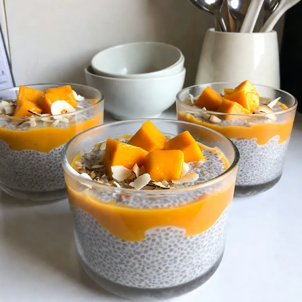 - 1 cup coconut milk (canned or carton) - 1/2 cup almond milk (or any plant-based milk) - 1/4 cup chia seeds - 1 ripe mango, pureed (reserve some chunks for topping) - 2 tablespoons maple syrup or honey (optional) - 1 teaspoon vanilla extract - A pinch of salt - Toasted coconut flakes for garnish Gathering these ingredients sets you up for success. Coconut milk gives a rich flavor. Almond milk adds creaminess without dairy. Chia seeds are tiny but mighty. They thicken the pudding and offer health benefits. Mango brings a sweet, fruity punch. You can use fresh or pureed mango. Maple syrup or honey is optional for extra sweetness. A pinch of salt enhances the flavors. Finally, toasted coconut flakes add texture and a tropical twist. When you combine these ingredients, you create a delightful treat. Enjoy this pudding as a snack, breakfast, or dessert. Each bite is refreshing and satisfying. {{ingredient_image_2}} Start by grabbing a medium mixing bowl. Pour in 1 cup of coconut milk and 1/2 cup of almond milk. Whisk them together until they blend well. Next, add 1 teaspoon of vanilla extract. Whisk again to mix the flavors. Now, it's time for the chia seeds. Sprinkle in 1/4 cup of chia seeds. If you want it sweeter, add 2 tablespoons of maple syrup or honey. Don’t forget a pinch of salt. Use a whisk to mix everything until well combined. Take 1 ripe mango and puree it until smooth. Gently fold the mango into your chia mixture. Make sure to keep some mango chunks aside for topping later. This adds a nice texture to your pudding. Cover the bowl tightly with plastic wrap or a lid. Place it in the refrigerator. Let it chill for at least 4 hours, or overnight if you can wait. This step helps the chia seeds absorb the liquid and thicken the pudding. When you’re ready to serve, take the pudding out of the fridge. Give it a gentle stir to break any clumps. Spoon the creamy pudding into pretty bowls or glasses. Top each one with the reserved mango chunks. For a fun touch, sprinkle toasted coconut flakes on top for extra flavor and crunch. To get the best texture, ensure the chia seeds mix evenly. Start by adding the chia seeds to the liquid slowly. Stir the mixture well right after adding them. This step helps keep the seeds from clumping. If you notice clumps, stir again after a few minutes. This helps break them apart. The goal is a smooth and creamy pudding without lumps. You can adjust the sweetness to fit your taste. Start with the amount of maple syrup or honey suggested in the recipe. After mixing, taste the pudding. If it needs more sweetness, add a little more syrup or honey. Remember, you can always add more, but you can’t take it out. Adjust until it tastes just right for you. For this recipe, use a medium mixing bowl for blending. A whisk works well to combine the liquids and chia seeds. You might also want a spatula for folding in the mango. If you have transparent glasses, use them for serving. They show off the beautiful layers of your pudding. Keep it simple, and enjoy the process! Pro Tips Use Fresh Mango: For the best flavor, choose a ripe, fresh mango. This will enhance the sweetness and overall taste of your pudding. Chill Overnight: For optimal texture, let the pudding set in the refrigerator overnight. This allows the chia seeds to fully absorb the liquid and create a creamy consistency. Experiment with Sweetness: Adjust the amount of maple syrup or honey according to your taste preferences. Some mangoes may be sweeter than others, so taste before adding. Layering for Presentation: For an impressive presentation, layer the mango puree and chia pudding in your serving glasses. This not only looks beautiful but also adds a delightful flavor contrast. {{image_4}} You can switch mango for other fruits. Blueberries, strawberries, or kiwi add fun flavors. Simply puree these fruits just like the mango. You can even mix different fruits for a colorful twist. This way, you can match the pudding to your taste and mood. If you want to avoid coconut and almond milk, try oat milk or soy milk. Both options work well and taste great. They keep the pudding creamy. You can also use cashew milk for a nutty flavor. Experiment with different plant-based milks to find your favorite. For added crunch and flavor, consider toppings like nuts or seeds. Chopped almonds or walnuts add a nice texture. You can also sprinkle pumpkin seeds or sunflower seeds on top. For a sweet touch, try adding more toasted coconut flakes. These toppings enhance the pudding and make it look beautiful. To store your mango coconut chia pudding, use airtight containers. Glass jars work well. They keep the pudding fresh and let you see the layers. You can also use plastic containers. Just make sure they seal tightly. The shelf life of chia pudding is about 4 to 5 days in the fridge. After this time, the pudding may lose its texture. Always check for any unusual smells or changes in color before eating. Can you freeze mango coconut chia pudding? Yes, you can! Freezing is a great way to save extra pudding. Use freezer-safe containers or bags. Leave some space for expansion while it freezes. When it’s time to enjoy your pudding, thaw it slowly in the fridge. This keeps the texture nice. Avoid using the microwave, as it can change the pudding’s consistency. After thawing, stir well to bring it back to a creamy state. Yes, you can easily make this dish vegan. Just use plant-based milk options. Coconut milk and almond milk are great choices. For sweetening, choose maple syrup instead of honey. All other ingredients are already vegan-friendly. This way, you keep the delicious flavor while staying true to a vegan diet. Chia seeds need about 4 hours to thicken properly. When mixed with liquid, they absorb it and expand. This process creates a gel-like consistency. For the best results, refrigerate overnight. This way, the pudding becomes creamy and thick. You can serve this pudding with many tasty sides. Fresh fruit like berri
