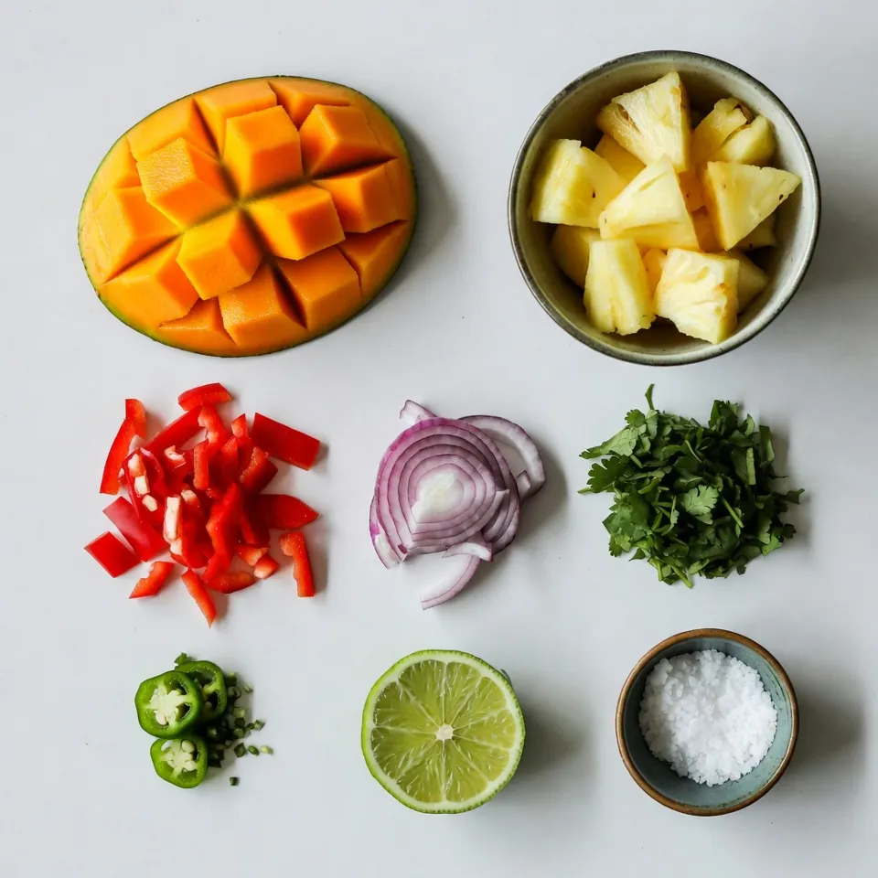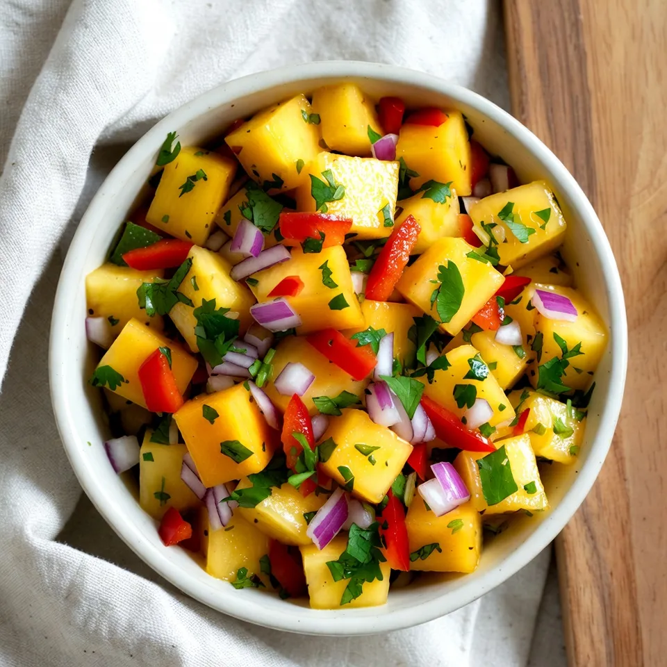 A refreshing and zesty salsa made with ripe mango, fresh pineapple, and vibrant vegetables, perfect for summer gatherings.