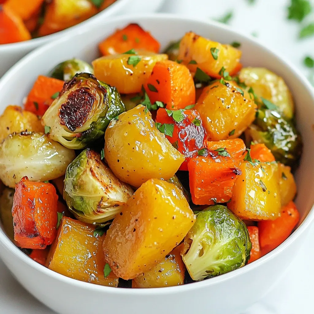 - 2 cups Brussels sprouts, halved - 1 cup butternut squash, diced into 1-inch cubes - 1 cup carrots, sliced into rounds - 1 red bell pepper, chopped - 3 tablespoons olive oil - 2 tablespoons pure maple syrup - 1 tablespoon Dijon mustard - 1 teaspoon garlic powder - 1 teaspoon smoked paprika - Salt and freshly cracked pepper to taste - Fresh parsley, chopped (for garnish) The key to this dish is fresh vegetables. I love using Brussels sprouts for their earthy flavor. Butternut squash adds a touch of sweetness. Carrots bring a nice crunch, and red bell pepper adds color and flavor. Now, let's dive into the seasoning. The olive oil coats the veggies, helping them roast evenly. Pure maple syrup gives a sweet touch that balances well with the Dijon mustard's tang. Garlic powder and smoked paprika enhance the flavor, giving depth to each bite. Don't skip the salt and pepper. They boost the taste and bring everything together. Finally, finish with fresh parsley for a pop of color and freshness. This combo creates a harmonious dish that is both tasty and visually appealing. {{ingredient_image_2}} - Preheat the oven to 425°F (220°C). This step is key to crisp veggies. - In a large mixing bowl, combine 2 cups of halved Brussels sprouts, 1 cup of diced butternut squash, 1 cup of sliced carrots, and 1 chopped red bell pepper. This mix brings color and taste. - In a separate small bowl, whisk together 3 tablespoons of olive oil, 2 tablespoons of pure maple syrup, 1 tablespoon of Dijon mustard, 1 teaspoon of garlic powder, 1 teaspoon of smoked paprika, salt, and pepper. Mix until smooth. This dressing adds a sweet and tangy kick. - Drizzle the maple Dijon mixture over the prepared vegetables. Toss them well so each piece is coated. - Line a large baking sheet with parchment paper for easy cleanup. Spread the veggies in a single layer. Make sure there’s space between them. - Roast in the preheated oven for 25-30 minutes. Halfway through, stir the vegetables to ensure even cooking. Check for tenderness and caramelization. They should be soft and golden. For great roasted vegetables, spacing is key. Spread the veggies evenly on the baking sheet. When they have space, they roast better. This helps them brown and caramelize nicely. If they are too close, they will steam instead. You want a crisp outside and tender inside. Check for tenderness by poking the veggies with a fork. They should feel soft but not mushy. Look for golden brown edges to see if they are caramelized. Stir halfway through to help even cooking. To amp up the taste, add spices like thyme or rosemary. These herbs complement the maple and Dijon flavors well. You can also try chili powder for extra heat. Seasonal vegetables work best for this recipe. In spring, use asparagus or peas. In the fall, sweet potatoes or parsnips are great choices. Adapt the recipe to what you find fresh at the store or farmer's market. This keeps each dish exciting and full of flavor! Pro Tips Choosing Fresh Vegetables: Opt for firm and vibrant vegetables for the best flavor and texture. Fresh produce enhances the overall taste of your dish. Customize Your Roasting Time: Different vegetables have varying roasting times. Keep an eye on them and adjust cooking times as needed for the perfect tenderness. Enhancing Flavor with Herbs: Add herbs like thyme or rosemary to the vegetable mix before roasting for an extra layer of flavor that complements the maple and Dijon. Storing Leftovers: Store any leftover roasted vegetables in an airtight container in the fridge for up to 3 days. They can be reheated or added to salads for a quick meal. {{image_4}} You can change up the vegetables in this dish for new flavors. Instead of Brussels sprouts, try using green beans or asparagus. Instead of butternut squash, sweet potatoes work great too. For a crunch, substitute carrots with parsnips. You can also swap red bell pepper for zucchini or eggplant. Each mix gives a unique taste and texture. Want to spice things up? Add a pinch of cayenne pepper or red pepper flakes to the dressing. For a sweeter dish, increase the maple syrup. If you're vegan, the recipe is already vegan-friendly since it uses no animal products. Just ensure your Dijon mustard is vegan too. For gluten-free, stick to gluten-free mustard and check the labels on your ingredients. To keep your Maple Dijon roasted vegetables fresh, place them in a sealed container. Use a glass or plastic container with a lid. Store the container in the fridge. They will last for about 3 to 5 days. Avoid stacking too many layers to keep them from getting soggy. When it’s time to enjoy the leftovers, I recommend reheating them in the oven. Preheat your oven to 350°F (175°C). Place the vegetables on a baking sheet. Heat them for about 10 to 15 minutes. This method keeps their flavor and texture intact. You can also use a microwave, but the oven gives better results. If using a microwave, heat in short bursts to avoid overcooking. Enjoy your tasty vegetables warm! Yes, you can use frozen vegetables. However, fresh vegetables give better taste and texture. Frozen veggies may contain added water. This can make the dish a bit soggy. If you decide to use frozen ones, roast them for a few extra minutes. Make sure to spread them out well on the baking sheet. This helps them roast nicely. You can store leftovers in an airtight container. They will stay fresh for about 3 to 5 days in the fridge. When you want to eat them again, just reheat in the oven. This keeps the flavors rich and the texture nice. You can also use the microwave, but the oven works best. These roasted vegetables go well with many main dishes. Try them with grilled chicken or fish. They also pair nicely with quinoa or rice. You can serve them alongside a hearty stew or a fresh salad. The sweet and tangy flavors complement many meals. This blog post outlines a tasty Maple Dijon Roasted Vegetables recipe. We covered fresh veggies, a simple dressing, and steps to achiev