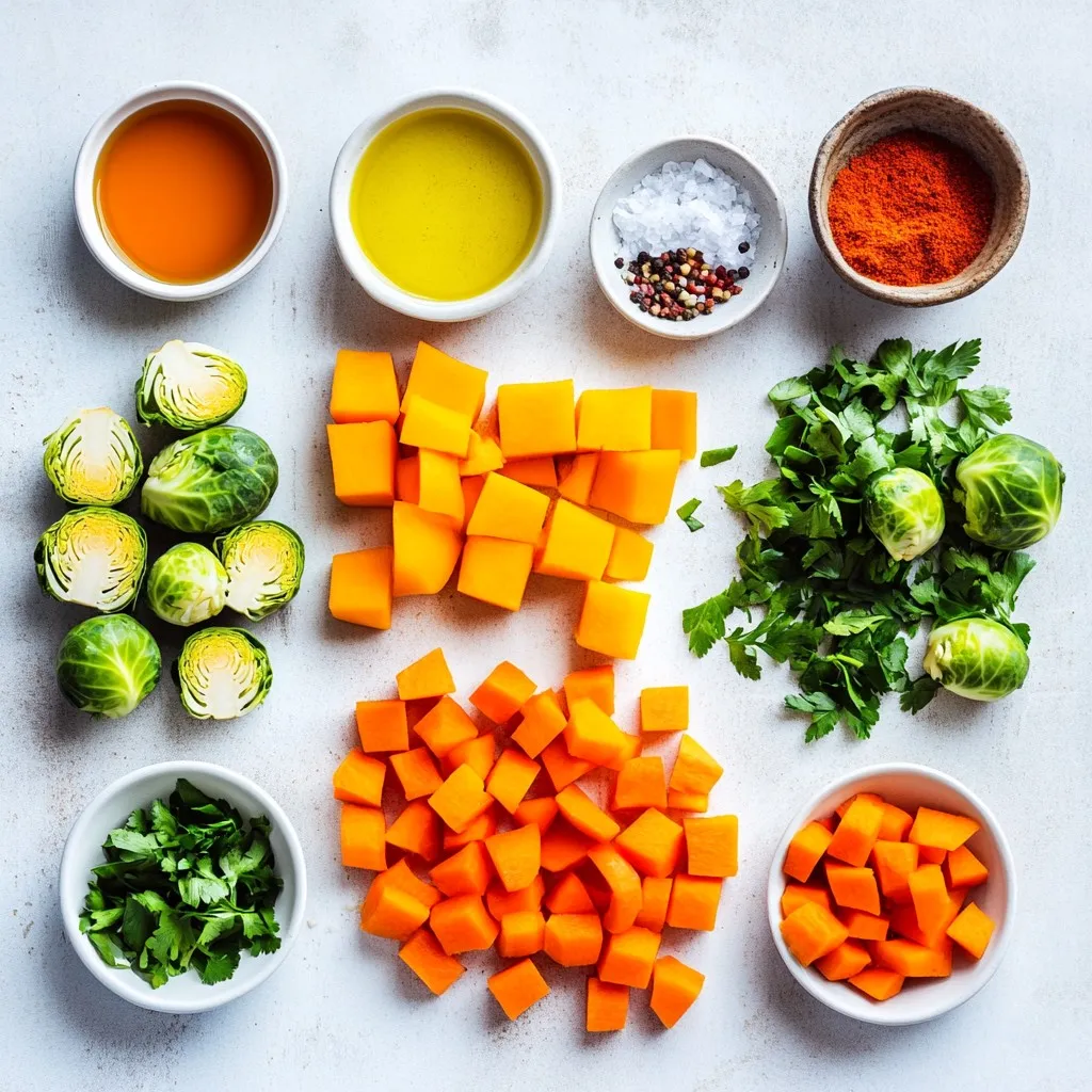 The key to this dish is fresh vegetables. I love using Brussels sprouts for their earthy flavor. Butternut squash adds a touch of sweetness. Carrots bring a nice crunch, and red bell pepper adds color and flavor.