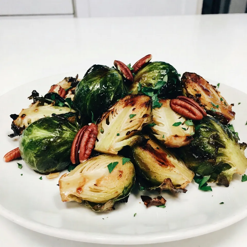 A delicious side dish featuring roasted Brussels sprouts with a sweet and tangy maple glaze.