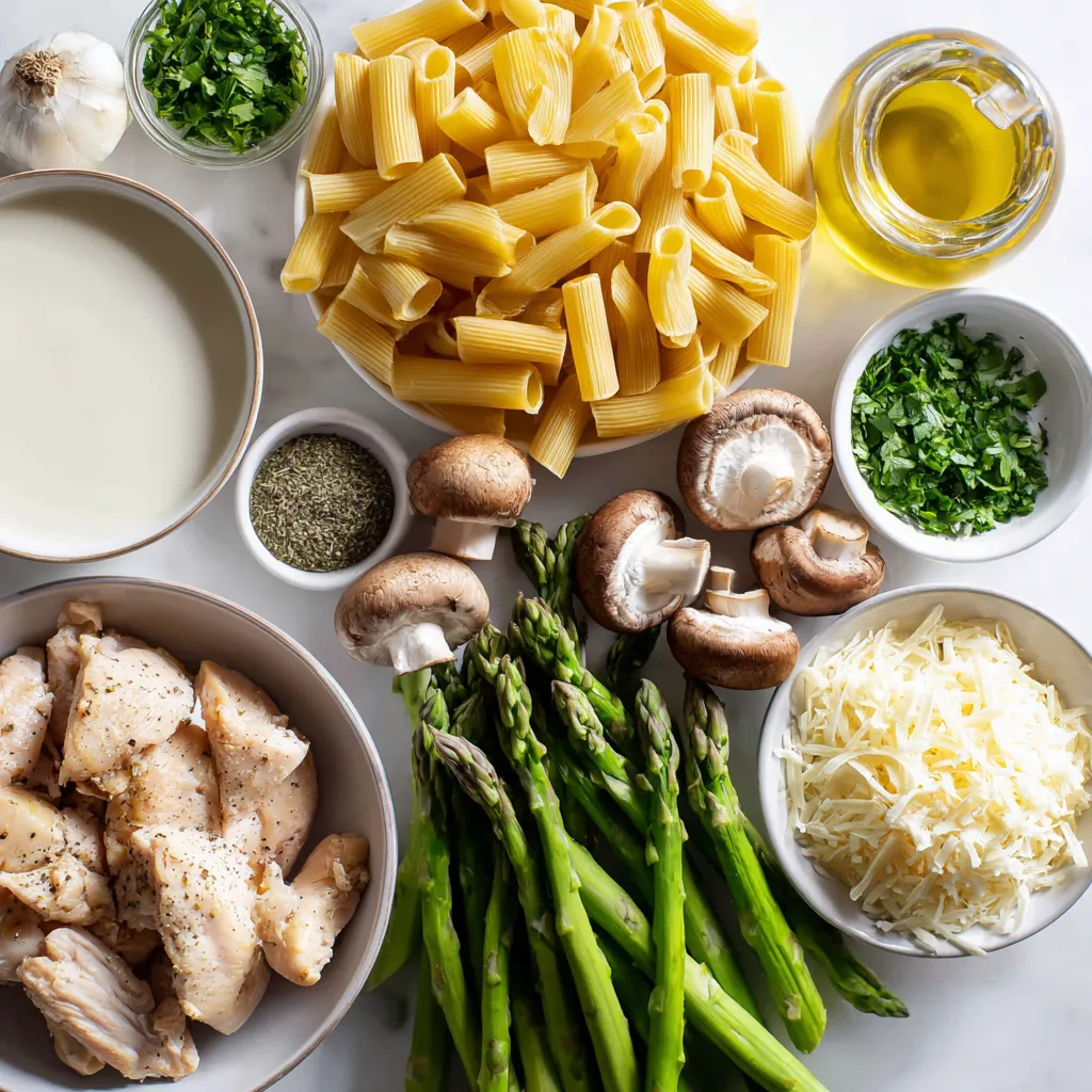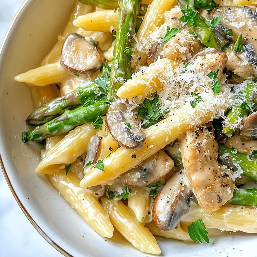 A creamy and delicious pasta dish featuring chicken, asparagus, and mushrooms.