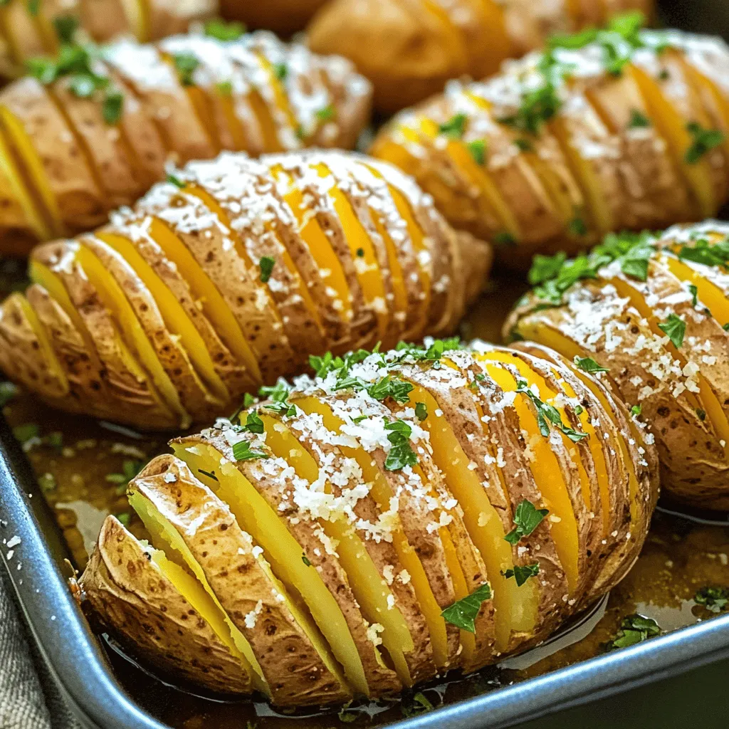 ![To make Parmesan Herb Hasselback Potatoes, you need the following ingredients: - 4 medium-sized russet potatoes - 1/4 cup extra virgin olive oil - 1/2 cup freshly grated Parmesan cheese - 2 teaspoons dried oregano - 2 teaspoons dried thyme - 2 teaspoons garlic powder - Sea salt and freshly cracked black pepper to taste - Fresh parsley, finely chopped (for garnish) Each ingredient plays a key role in building flavor. The russet potatoes provide a fluffy inside and a crispy skin. Olive oil adds richness and helps the herbs stick. Parmesan cheese gives a sharp, salty bite that enhances the potatoes. The oregano and thyme bring warmth and earthiness. Garlic powder adds depth without being overpowering. Finally, parsley not only brightens the dish but also adds a fresh finish. For the full recipe and step-by-step instructions, check out [Full Recipe]. 1. Preheat the oven to 425°F (220°C). This high heat gives the potatoes a nice crisp. 2. Rinse the potatoes under cold water to remove dirt. After washing, dry them with a towel. 1. Take one potato and place it on a cutting board. 2. Use wooden chopsticks on each side for guidance. This helps you avoid cutting all the way through. 3. Carefully slice the potato into thin cuts, about 1/8 inch apart. Stop just before the bottom. Repeat this for all potatoes. 1. In a small bowl, combine 1/4 cup of olive oil, 2 teaspoons of oregano, 2 teaspoons of thyme, and 2 teaspoons of garlic powder. 2. Add sea salt and pepper to taste. Mix well until combined. 1. Brush the olive oil mixture over the potatoes. Make sure it seeps into the cuts. 2. Sprinkle 1/2 cup of freshly grated Parmesan cheese on top, letting it fill the sliced areas. 3. Place the potatoes on a baking sheet lined with parchment paper. Bake for 45 to 50 minutes. Look for a golden brown color and crispy edges. 4. After baking, remove them from the oven and cool for a few minutes. Serve warm, garnished with fresh parsley. For the complete recipe, check out the [Full Recipe]. To get those perfect crispy edges, bake at 425°F (220°C). This high heat helps create a golden crust. Using parchment paper is key. It prevents sticking and makes for easy cleanup. Plus, it helps the heat circulate around the potatoes. You can switch up the herbs and spices for your taste. Try rosemary or basil for a fresh twist. If you want more depth, add smoked paprika or a pinch of cayenne. For cheese lovers, consider mixing in some Gruyère or cheddar. These options add a new layer of flavor. Presentation is essential. Serve the potatoes on a rustic wooden or ceramic platter. This highlights their golden, crispy edges. Add fresh parsley around them for color. They pair well with roasted chicken, grilled veggies, or a fresh salad. These sides balance the richness of the potatoes. For an extra touch, drizzle some garlic butter on top right before serving. For the full recipe, check out Parmesan Herb Hasselback Potatoes. {{image_4}} You can try different types of potatoes for this dish. Sweet potatoes add a nice twist. Their natural sweetness pairs well with the savory cheese. Yukon Gold potatoes are another great choice. They offer a creamy texture and buttery flavor that works wonderfully. Switching up your seasonings can change the whole dish. Using fresh herbs gives a bright taste. Try fresh thyme or rosemary for a fragrant boost. Dried herbs also work well, but fresh makes a difference. You can also change the cheese. Try Gruyère for a nutty flavor. Feta adds a tangy kick that is hard to resist. Toppings can take your Hasselback potatoes to the next level. Sprinkle some crispy bacon bits on top for a salty crunch. Fresh chives will add a pop of color and onion flavor. You can also drizzle sour cream or Greek yogurt on top. This adds creaminess and tang to each bite. To store leftover Parmesan Herb Hasselback Potatoes, follow these steps: - Refrigeration guidelines: Place the cooled potatoes in an airtight container. They will stay fresh for about 3 to 4 days in the fridge. Make sure the lid seals tightly to keep moisture out. - Freezing options for leftovers: You can freeze these potatoes. Wrap each potato in plastic wrap, then place them in a freezer bag. They can last up to 2 months in the freezer. When ready to eat, let them thaw in the fridge overnight. To enjoy your potatoes again, reheating properly is key. - Best reheating methods for crispy texture: The oven is your best friend for reheating. Preheat it to 350°F (175°C). Place the potatoes on a baking sheet and heat for about 15 to 20 minutes. This helps restore their crispy edges. - Microwave versus oven: While you can use the microwave, it won’t keep the potato crispy. If you’re in a hurry, microwave on medium for about 1 to 2 minutes. Just know, the texture won't be as great as the oven method. For the full recipe, check out the details above. Hasselback potatoes are thinly sliced potatoes that bake up crispy and tender. The name comes from a Swedish restaurant called Hasselbacken. They have a unique look with slices that fan out. This style allows for great flavor and texture. Typically, you should bake Hasselback potatoes for 45 to 50 minutes at 425°F (220°C). They are done when the outside is golden brown. The insides should feel soft when pierced with a fork. Yes, you can prep these potatoes ahead. Slice and season them, then cover and refrigerate. When ready to bake, let them sit at room temp for about 15 minutes. This helps them cook evenly. You can reheat leftovers in the oven to keep them crispy. Russet potatoes are the best choice. They have a high starch content, making them fluffy inside. Their thick skin also crisps nicely. Other potatoes may not hold the same shape or texture. Absolutely! You can mix and match herbs and spices. Try rosemary, smoked paprika, or even chili flakes for heat. Different cheeses like cheddar or feta can also add a twist. In this blog post, we've explored making delicious Parmesan Herb Hasselback potatoes