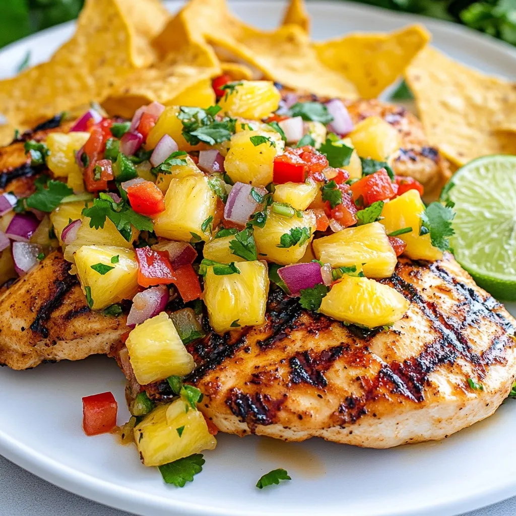 A vibrant and zesty chicken dish topped with fresh pineapple salsa, perfect for grilling.