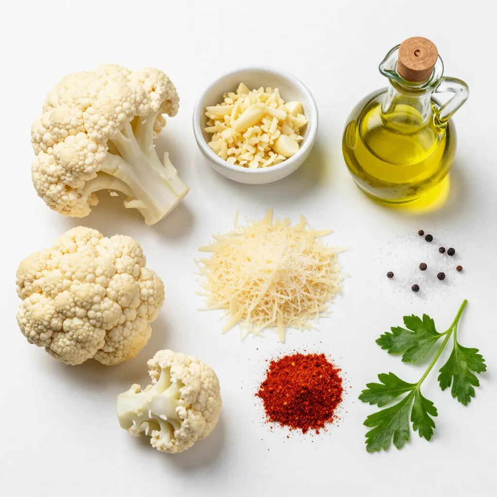 To make roasted garlic parmesan cauliflower, you need fresh ingredients. Start with a large head of cauliflower. Cut it into bite-sized florets. This size helps it cook evenly. Use four tablespoons of extra virgin olive oil. This oil adds a rich flavor and helps the garlic stick. Mince five cloves of garlic finely. This will give the dish a strong, savory taste.