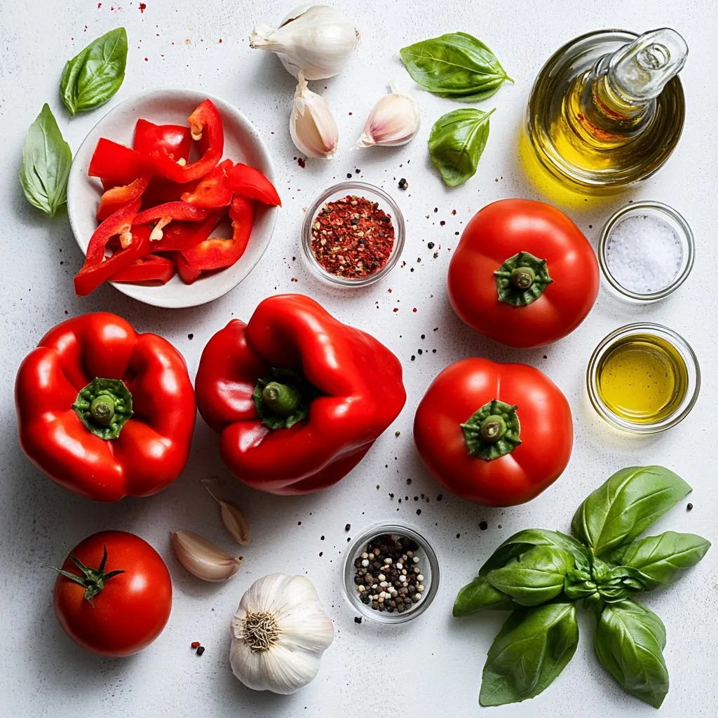 To make roasted red pepper tomato soup, you need fresh and tasty ingredients. Red bell peppers give a sweet taste. Tomatoes add richness and acidity. Onions and garlic bring depth. The broth makes it smooth and warm. Spices like basil and smoked paprika elevate the flavor. Olive oil adds healthy fat and helps cook the veggies. Salt and pepper balance the dish. Finally, fresh basil and cream make it look great.