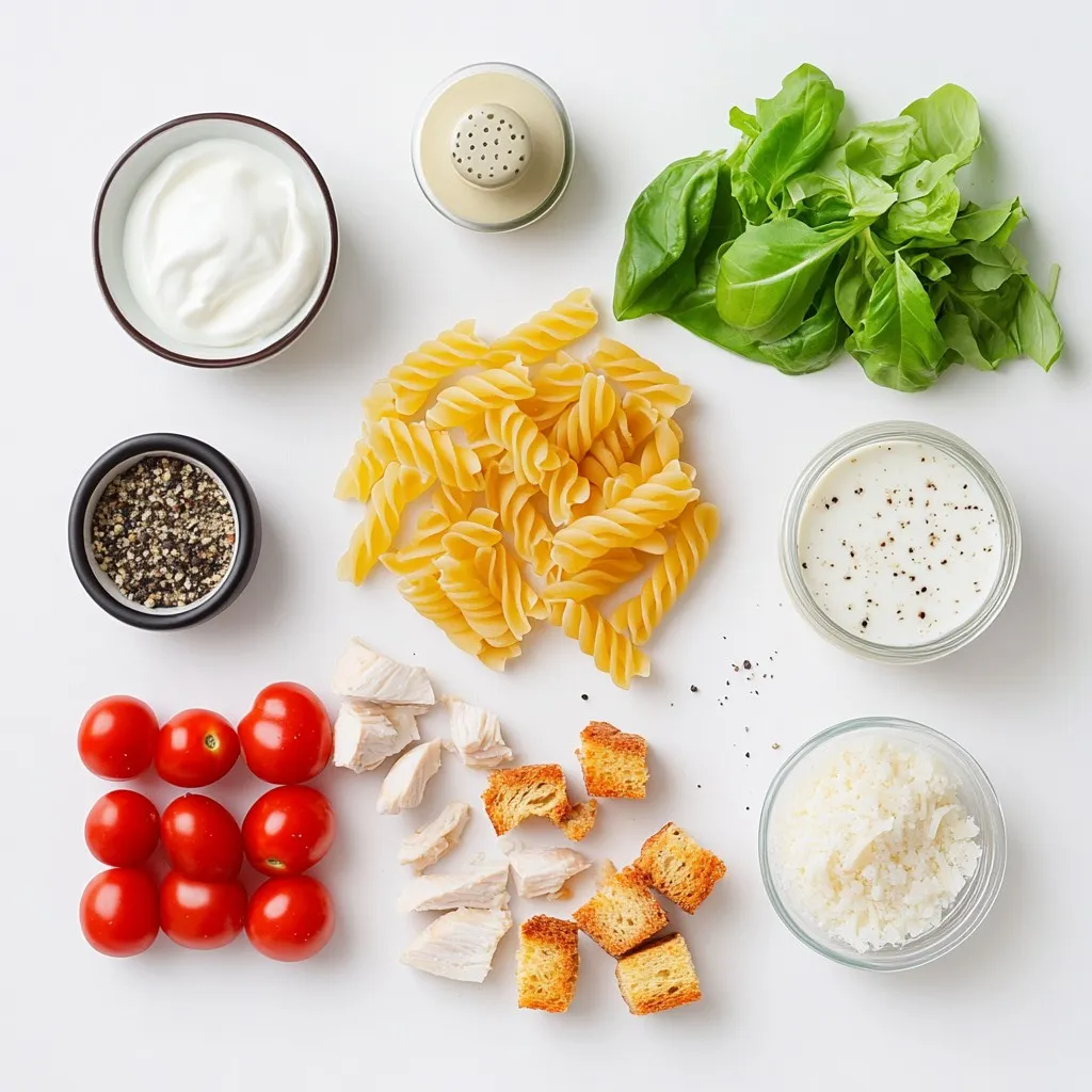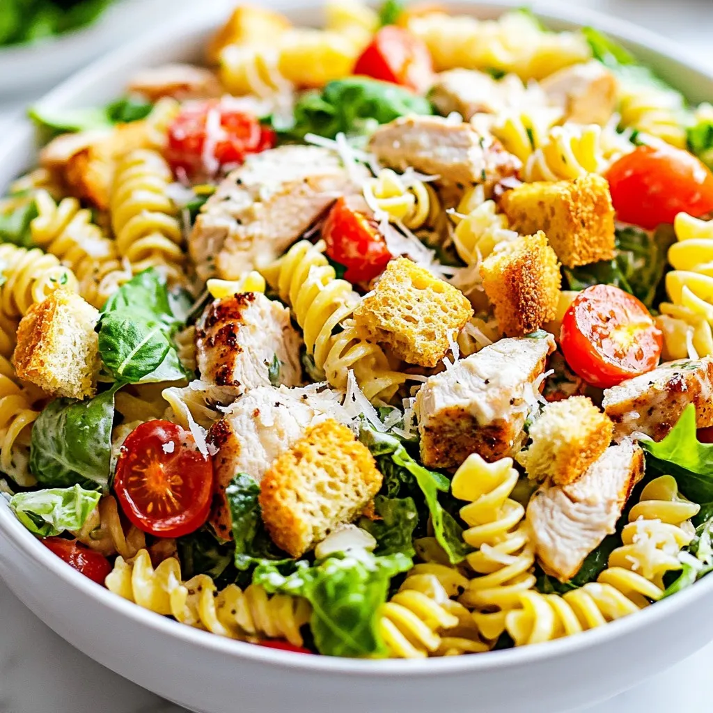 To make this Chicken Caesar Pasta Salad, gather these simple ingredients. First, you need rotini pasta. This pasta shape holds the dressing well. Next, you’ll want cooked chicken breast. Dice it into small pieces for easy eating. Romaine lettuce adds a nice crunch. Cherry tomatoes give a burst of flavor.