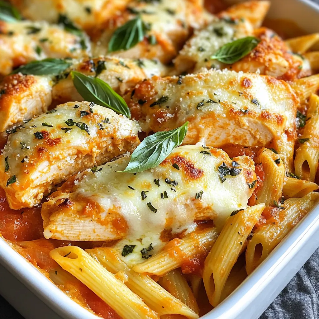 A delicious and comforting dish featuring tender chicken, pasta, and a rich tomato sauce topped with melted mozzarella and Parmesan cheese.
