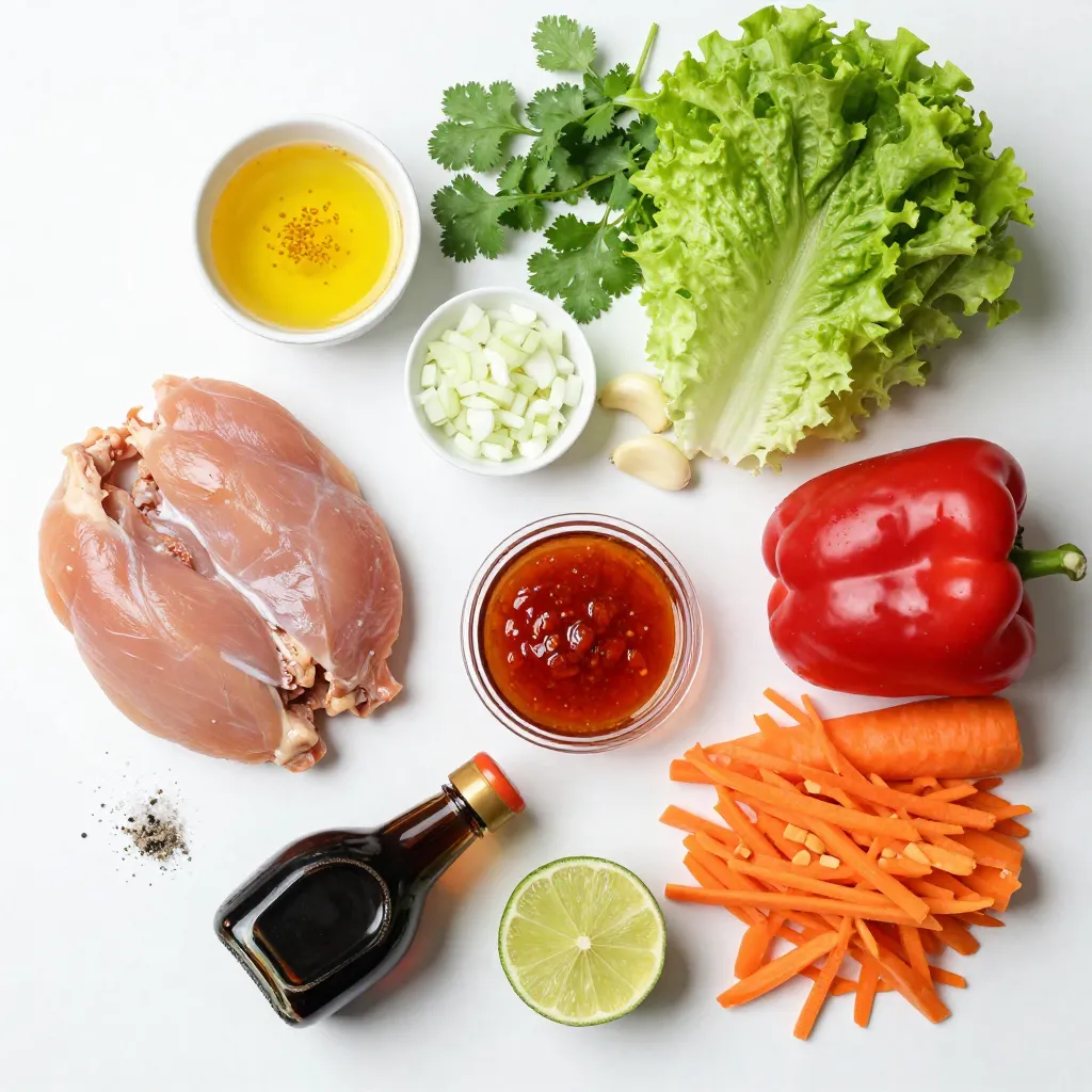 To make Sweet Chili Chicken Lettuce Wraps, gather these essential ingredients. Ground chicken is the main protein. It cooks quickly and absorbs flavors well. The sesame oil adds a nice nutty taste. Onions and garlic bring depth to the dish. Diced red bell peppers and grated carrots add color and crunch. Sweet chili sauce gives it a sweet and spicy kick. Soy sauce adds umami, while lime juice brightens the flavors. Fresh lettuce leaves act as the wrap, holding everything together. You can add chopped peanuts for extra texture and flavor.