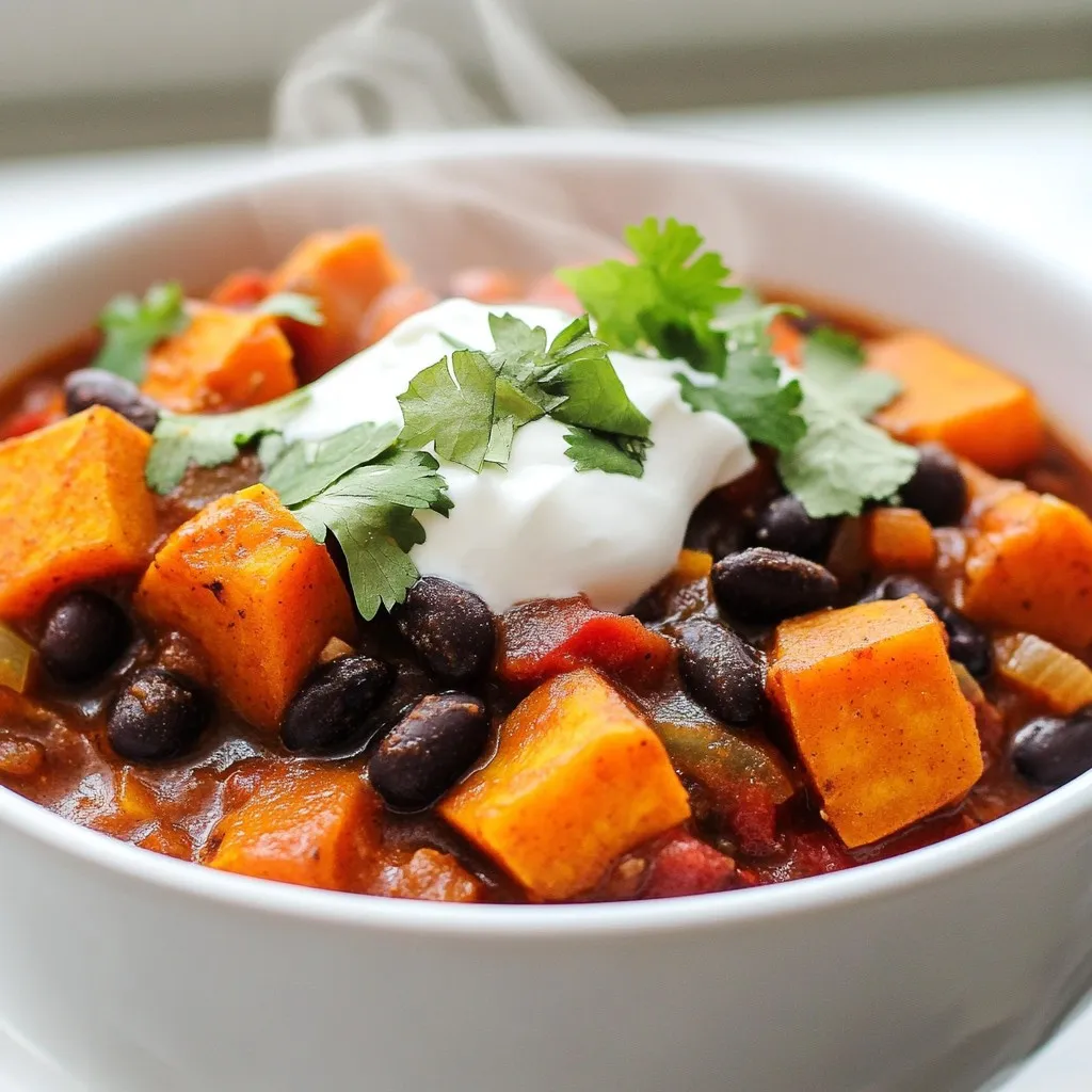 A hearty and flavorful chili made with sweet potatoes, black beans, and spices, perfect for a comforting meal.