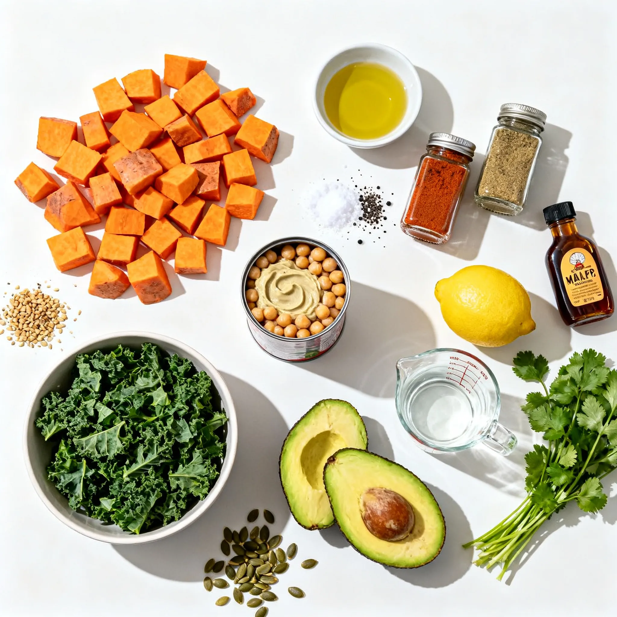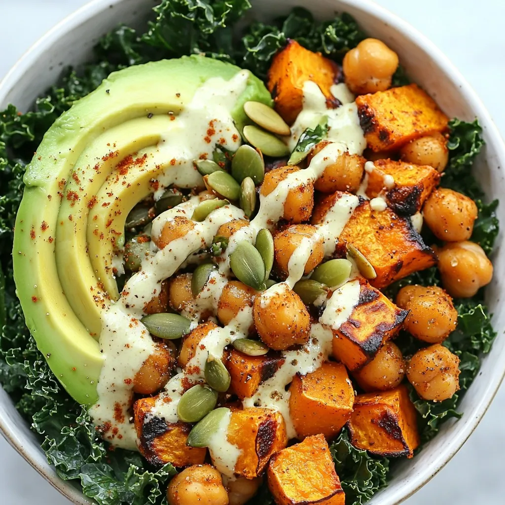- 2 medium sweet potatoes, peeled and cut into bite-sized cubes - 1 can (15 oz) chickpeas, thoroughly drained and rinsed - 2 tablespoons olive oil - 1 teaspoon smoked paprika - 1 teaspoon ground cumin - Salt and freshly cracked black pepper to taste - 3 cups curly kale, stems removed and chopped - 1 ripe avocado, halved and sliced - 1/4 cup tahini - 2 tablespoons freshly squeezed lemon juice - 1 tablespoon pure maple syrup - 1/4 cup cold water - 1/4 cup pumpkin seeds - Fresh cilantro or parsley leaves {{ingredient_image_2}} - Preheat oven to 425°F (220°C). - Cube and peel the sweet potatoes into bite-sized pieces. - Drain and rinse the chickpeas thoroughly. - Combine sweet potatoes and chickpeas on a baking sheet. - Drizzle with olive oil, then add smoked paprika, ground cumin, salt, and pepper. - Toss to coat everything evenly. - Roast for 25-30 minutes. Toss halfway to ensure even cooking. - In a medium bowl, whisk together tahini, lemon juice, maple syrup, and water. - Adjust the water as needed for your desired sauce thickness. - In the last 5 minutes of roasting, add chopped kale to the baking sheet. - Toss gently with sweet potatoes and chickpeas. - Divide the roasted mix into four bowls. - Add sliced avocado on top of each bowl. - Drizzle with tahini sauce for extra flavor. - Sprinkle with pumpkin seeds and fresh herbs for a finishing touch. To get sweet potatoes and chickpeas just right, I start with high heat. Preheat your oven to 425°F (220°C). This helps them caramelize well. Cut sweet potatoes into small cubes. Small pieces cook faster and become tender. Toss sweet potatoes and chickpeas with olive oil, smoked paprika, cumin, salt, and pepper. This makes sure they are flavorful. Spread them out on the baking sheet. Avoid crowding for better roasting. Toss them halfway through cooking for even color. They should be golden-brown when done. You can add your favorite veggies to these bowls. Try bell peppers, carrots, or broccoli. Each one brings a new flavor and texture. For protein, consider tofu or tempeh. Both options are tasty and fill you up. You can marinate them in your favorite sauce for extra flavor before roasting. Mix and match to suit your taste. This way, your Buddha bowl stays fresh and exciting. Meal prepping makes cooking easier. Roast a big batch of sweet potatoes and chickpeas. Store them in airtight containers. They last up to five days in the fridge. You can also wash and chop your kale ahead of time. Just keep it dry to avoid wilting. When you are ready to eat, reheat everything in the oven or microwave. This keeps the flavors intact. Enjoy your meal without the fuss of daily cooking. Pro Tips Use Fresh Spices: Fresh spices have a more potent flavor, so consider using freshly ground cumin and smoked paprika for a more vibrant taste in your Buddha bowls. Perfectly Cooked Sweet Potatoes: To ensure even cooking, make sure your sweet potato cubes are uniform in size. This will help them roast at the same rate and achieve that golden-brown color. Customize Your Greens: If you don’t have kale, feel free to substitute with spinach or Swiss chard. These greens can also provide a delicious flavor and nutritional boost. Storage Tips: Store any leftover tahini sauce in an airtight container in the fridge. It can last for about a week and can be drizzled on salads or sandwiches for added flavor. {{image_4}} You can easily adapt this recipe for different diets. For a gluten-free meal, all the ingredients listed work well. Chickpeas are naturally gluten-free, so you can use them without worry. If you want to swap out sweet potatoes, try butternut squash or quinoa instead. These options also bring rich flavors. I love to change my Buddha bowls with the seasons. In winter, add brussels sprouts for a hearty touch. Roast them alongside the sweet potatoes for a nice crunch. In summer, try adding zucchini and corn. These veggies add fresh flavors and a pop of color. They keep the dish light and vibrant. To spice things up, add chili flakes or harissa. These will give your bowls a kick. If you prefer a milder dish, try fresh herbs like basil or mint instead. They add a refreshing note. You can also play with spices like coriander or turmeric. Each option brings a new twist to the bowl. To keep your Sweet Potato Chickpea Buddha Bowls fresh, use airtight containers. Glass containers work well and help avoid any strong odors. Let the food cool before sealing to prevent condensation. Store in the fridge for up to four days. You can freeze roasted sweet potatoes and chickpeas. First, cool them completely, then place them in freezer bags. Squeeze out as much air as you can before sealing. For best results, use within three months. To thaw, leave them in the fridge overnight. Reheat in the oven or microwave until hot. In the fridge, the roasted sweet potatoes and chickpeas last about four days. Kale stays good for about two days after cooking. Signs of spoilage include an off smell, slimy texture, or discoloration. Always check your food before eating! To make this recipe vegan, use the same ingredients. Sweet potatoes, chickpeas, and kale are all plant-based. The tahini sauce is also vegan. Just make sure to check your maple syrup for any additives. Enjoy the rich flavors without any animal products. Yes, you can! Other beans work well in this dish. Try black beans, kidney beans, or even lentils. Each will add a unique taste and texture. Just ensure they are cooked and ready to use when you mix them with the sweet potatoes. If you can't find tahini, use almond butter or sunflower seed butter. Both options add creaminess and flavor. You can also blend roasted sesame seeds with olive oil to make a quick tahini substitute. To lower the carbs, reduce the amount of sweet potatoes. Instead, add more leafy greens or cauliflower rice. This keeps the bowl filling and nutritious while cutting down on carbs. Yes, this recipe is great for meal prep! You can roast the sweet potatoes and chick