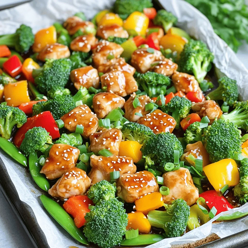 After baking, take the sheet out carefully. Mix 1 tablespoon of cornstarch with 2 tablespoons of water to make a slurry. Stir this mixture into the chicken and veggie mix to thicken the sauce. Return it to the oven for another 5 minutes. This step makes the sauce glossy and rich.