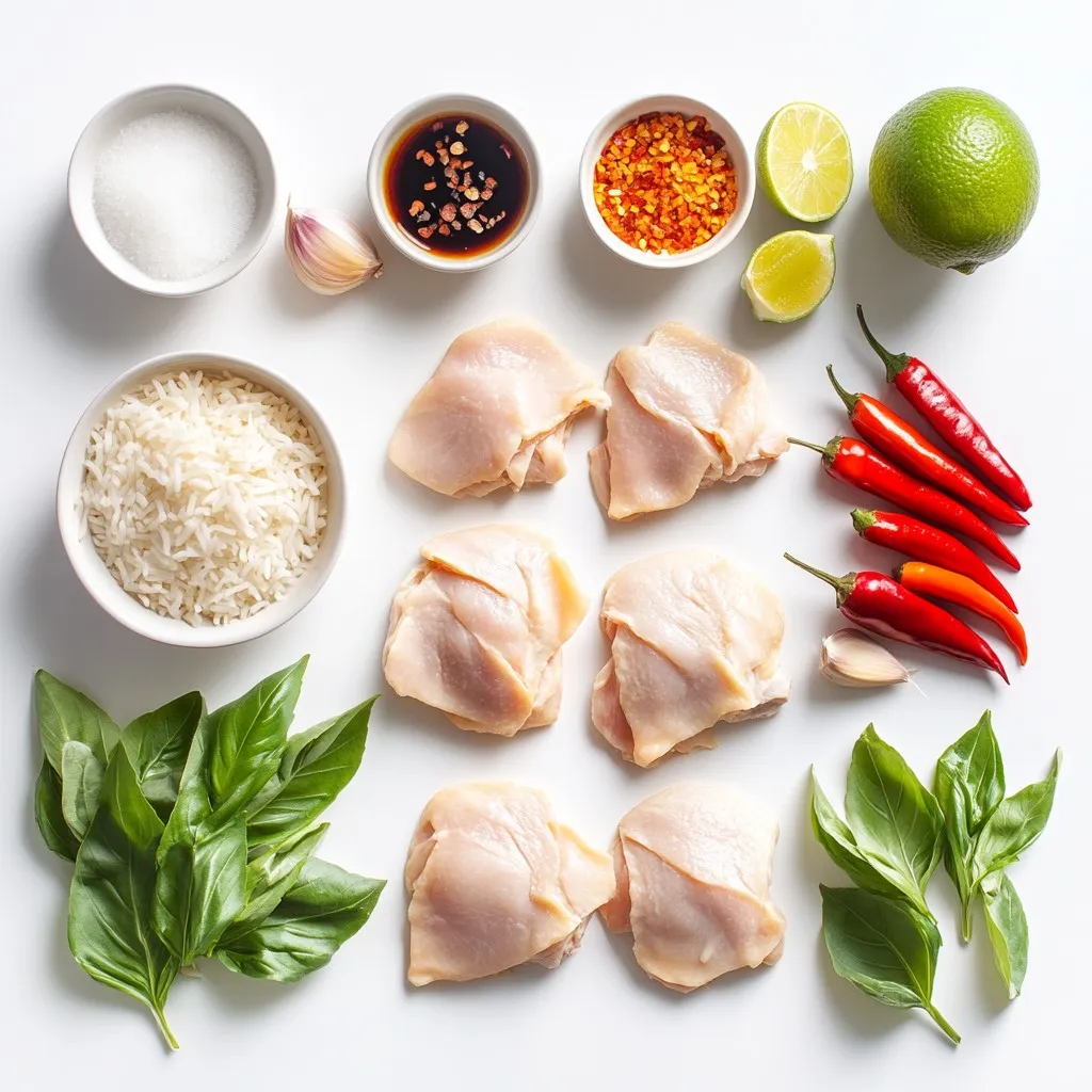 A flavorful and aromatic stir-fry featuring tender chicken thighs, fresh Thai basil, and a savory sauce, served over jasmine rice.