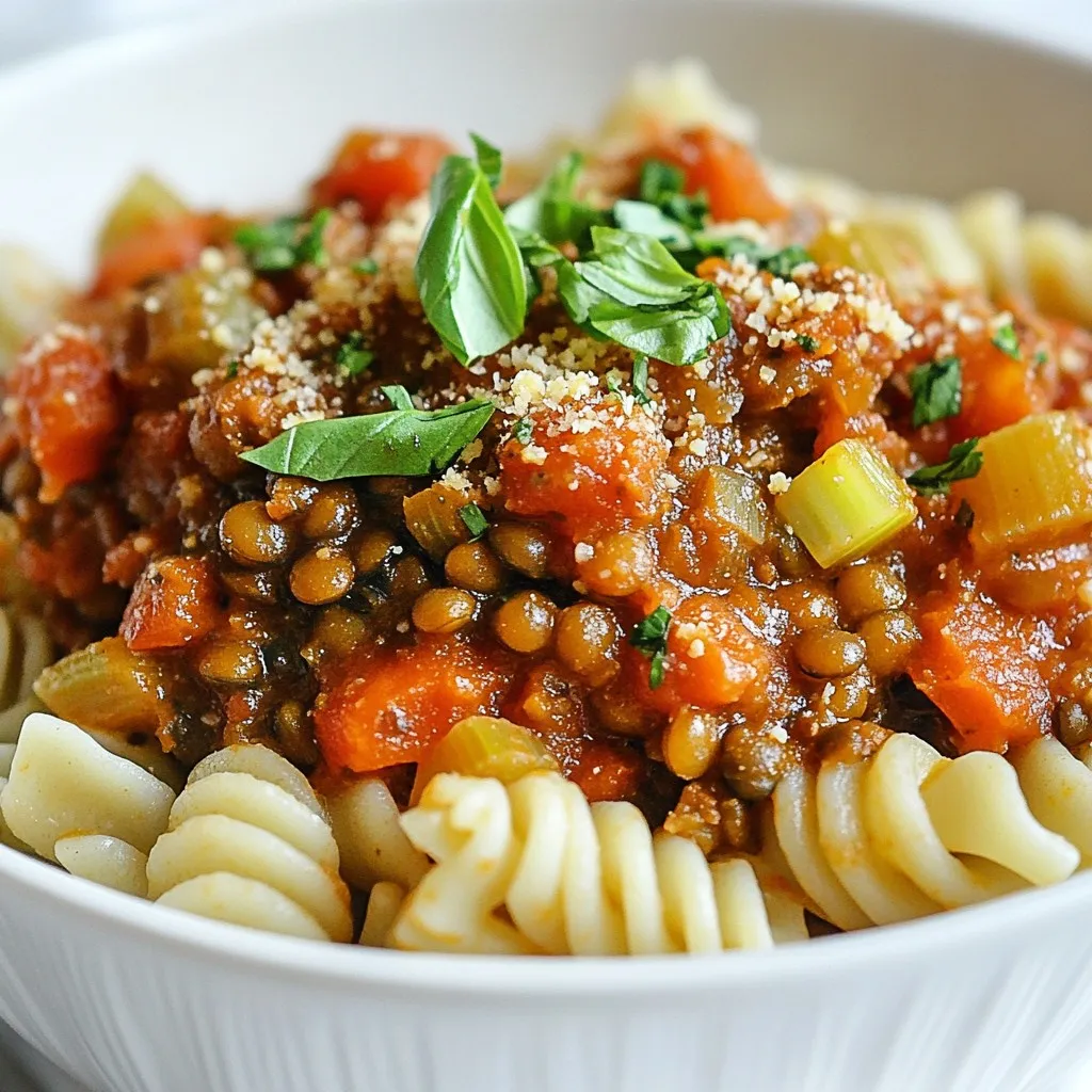 A hearty and flavorful vegan bolognese made with lentils and fresh vegetables, perfect for pasta lovers.